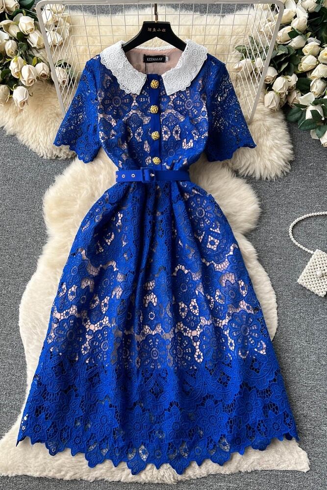 セレブフレンチレトロ重工業中空刺繍レースレースドールカラーウエストスリムドレス lyxaj47460205749