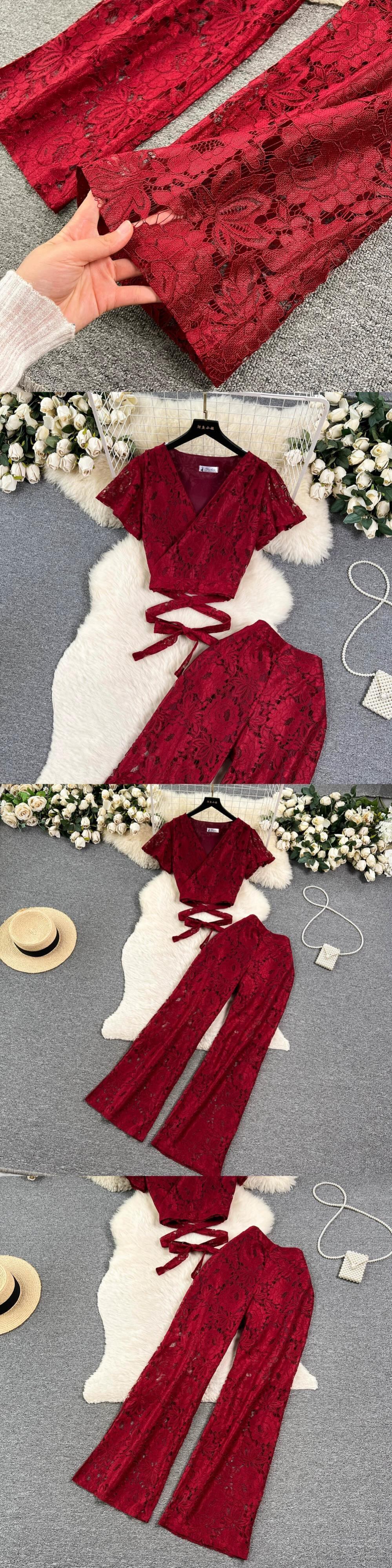 フランスのレディース スタイル スーツ レディース 夏レース刺繍中空 V ネック タイウエスト ショート シャツ トップ + ワイドレッグ スリムフィット パンツ サマー 夏物 Vネック lyxaj92682932380