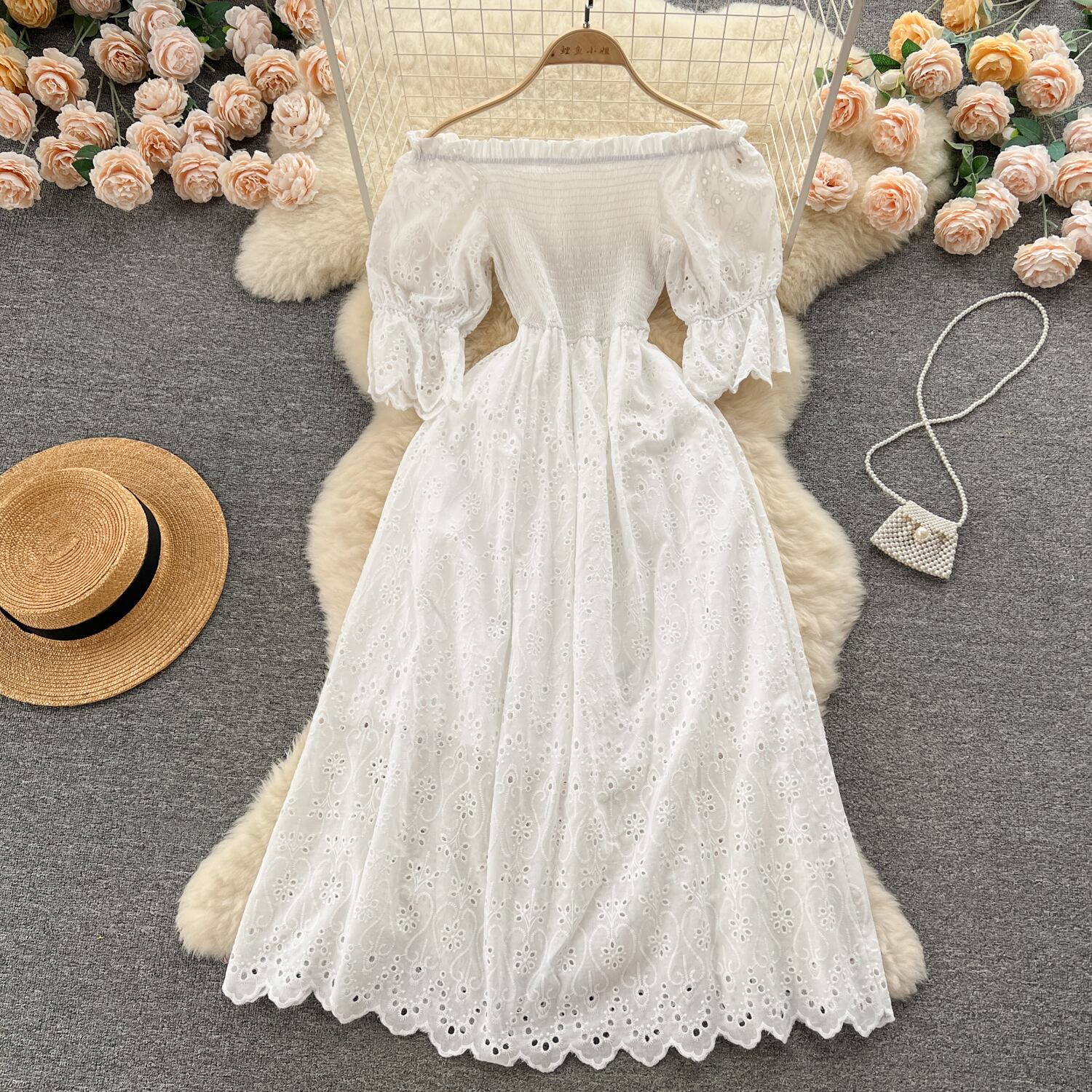 ホリデースタイルワンネックドレス女性の夏の新しい中空パフスリーブプリーツデザインウエストハイエンド気質ロングスカート サマー 夏物 lyxaj1352326