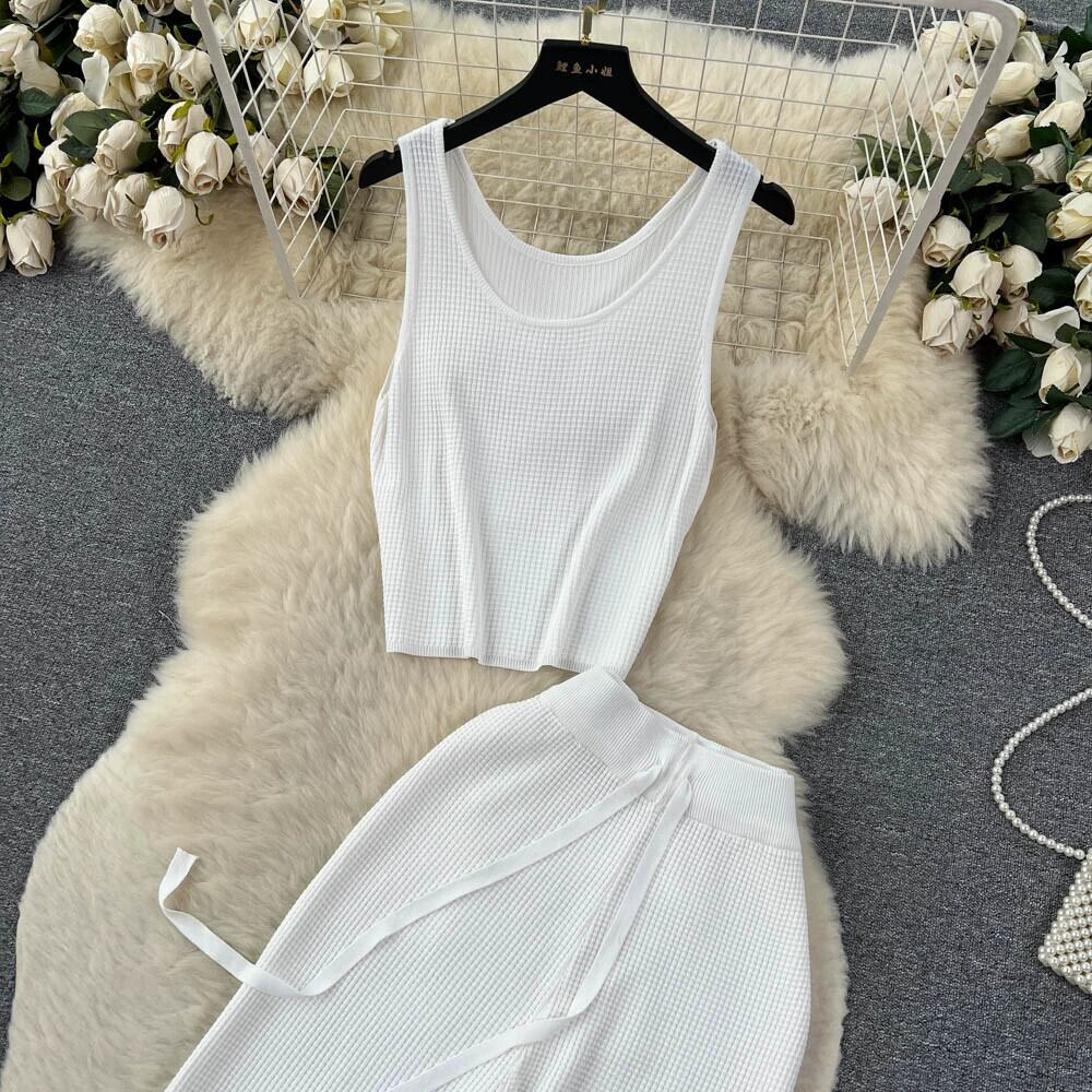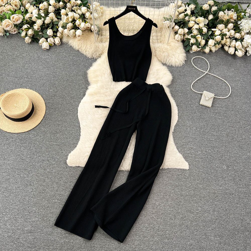 有能サマーニットスーツレディースソリッドカラーショートノースリーブベストトップ+カジュアルワイドレッグパンツツーピーストレンディ 半袖 ハーフスリーブ 夏物 lyxaj32992974630