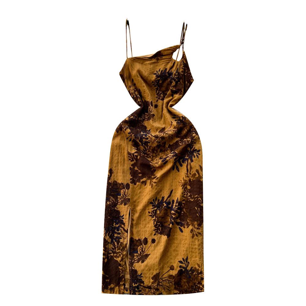 中国風国民風プリントサスペンダードレス女性の夏の不規則なデザインセンススプリットkスリムスリムスカート サマー 夏物 lyxaj37333383680