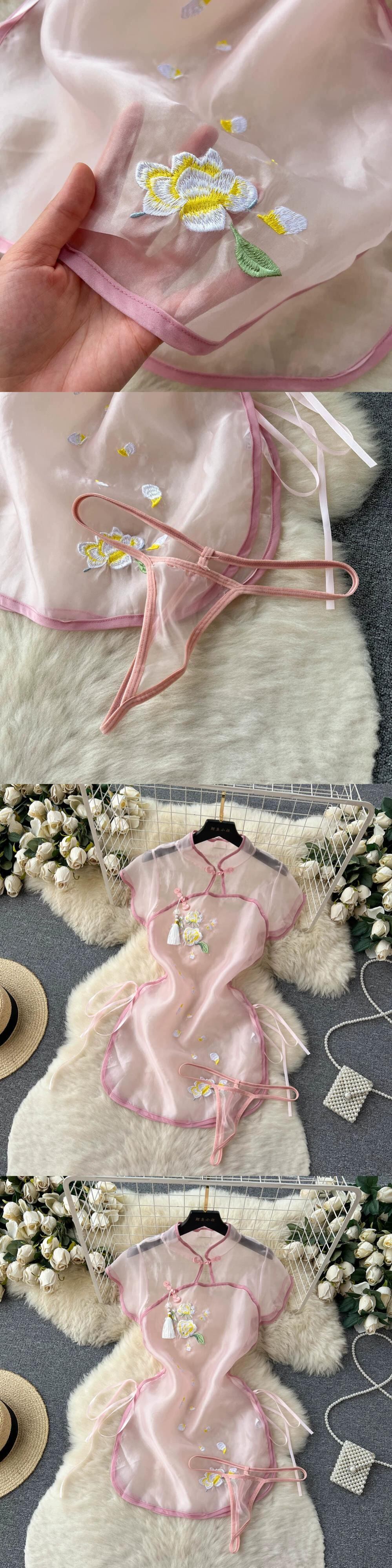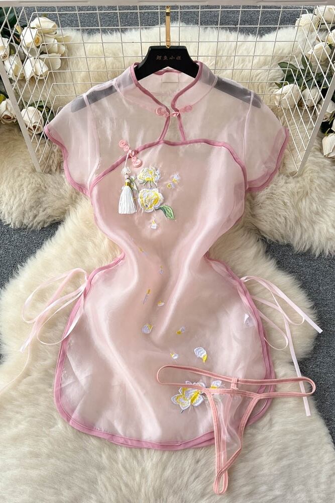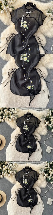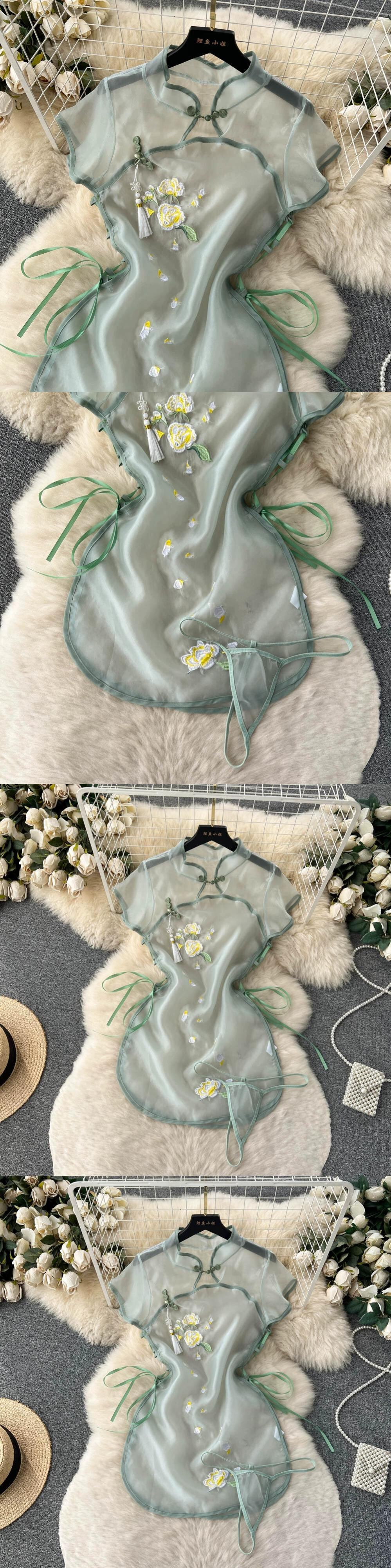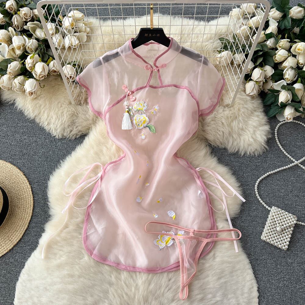 中国風のチャイナドレス女性の夏のセクシーな視点メッシュ刺繍ストラップデザイン感情的に興味深いスカート サマー 夏物 lyxaj49813209087