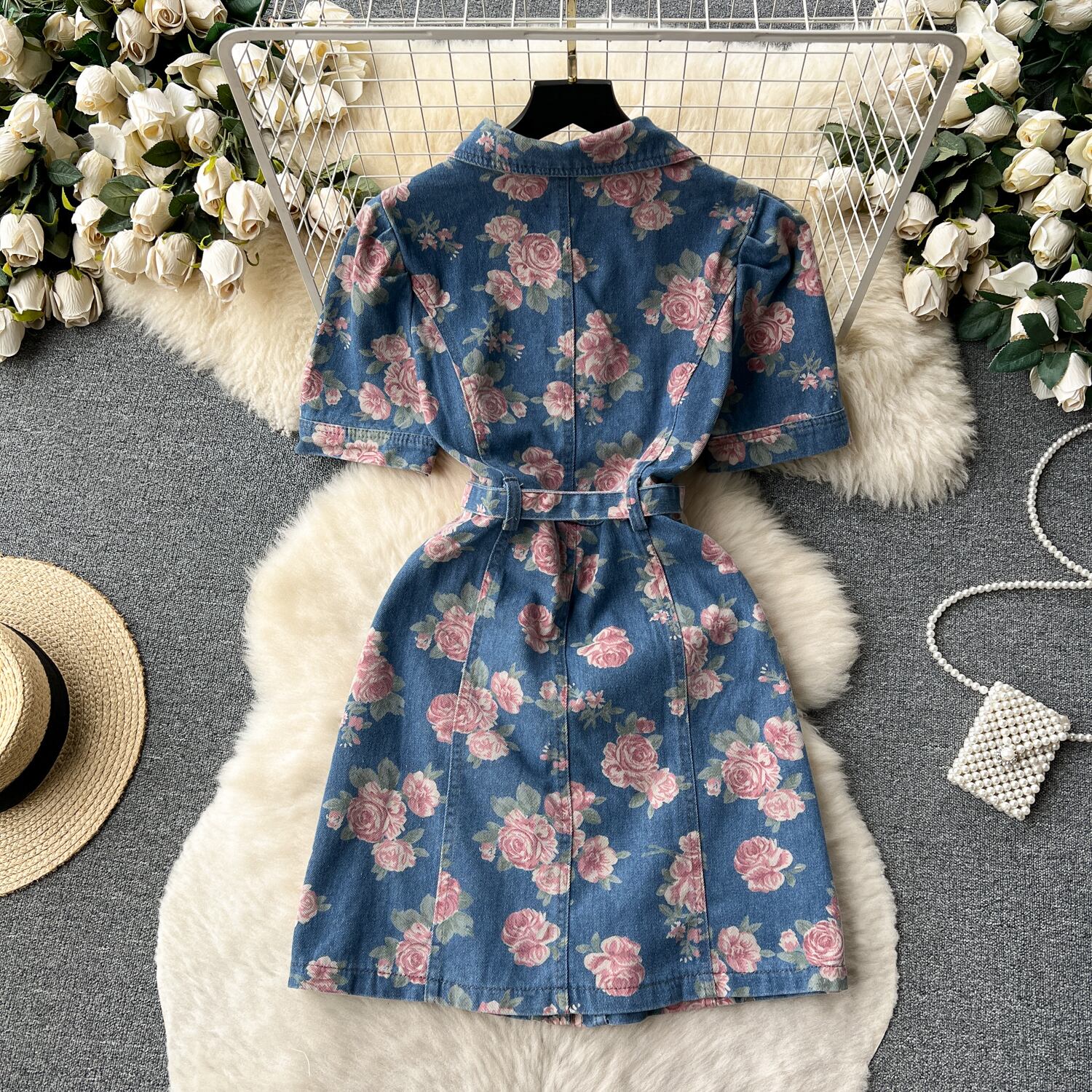 シックな香港スタイルのレトロプリントデニムスカート 2023 新しいブレストスリムフィットショート年齢軽減ドレス女性のサマードレス 夏物 lyxaj65448886148