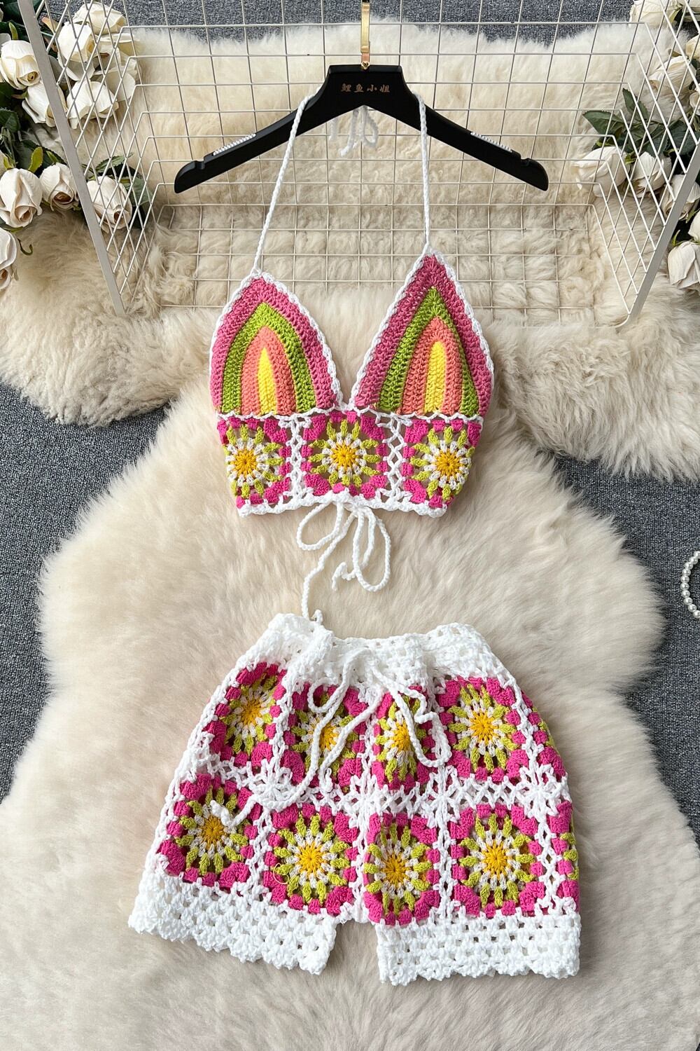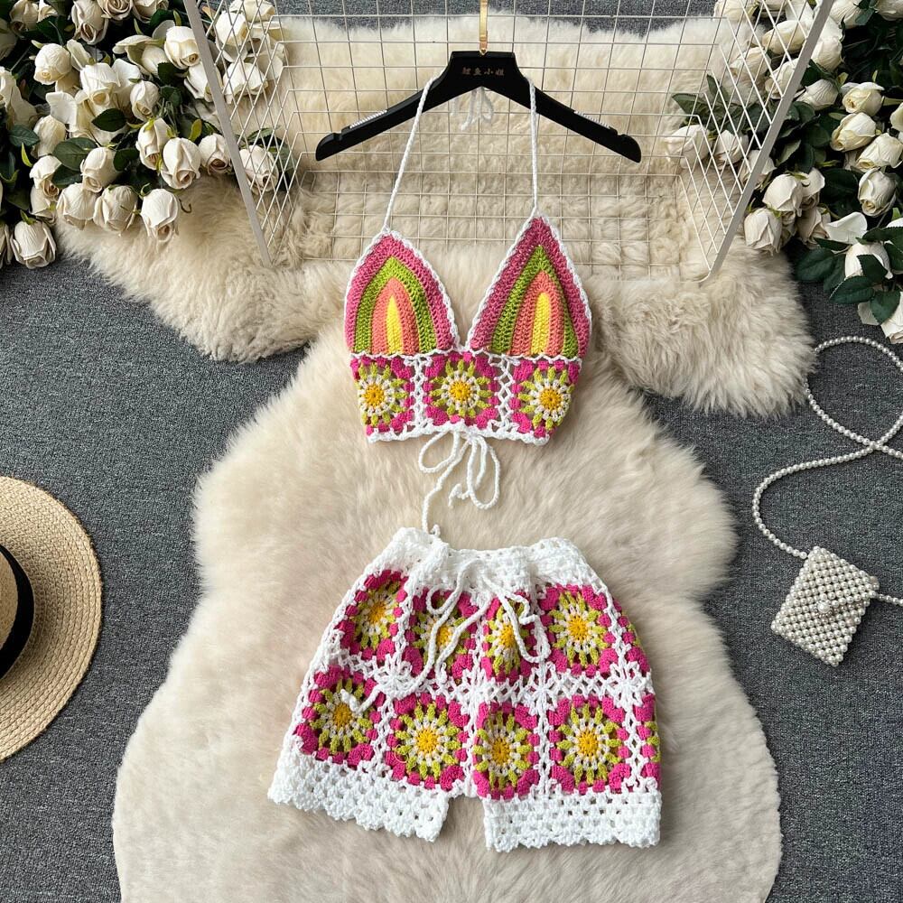 ボヘミアンニットスーツ女性夏中空刺繍背中の開いたスリングチューブトップ + 甘いクールな女の子ショートパンツ 大人ガーリー スウィート キュート カジュアル サマー 夏物 lyxaj40879466129