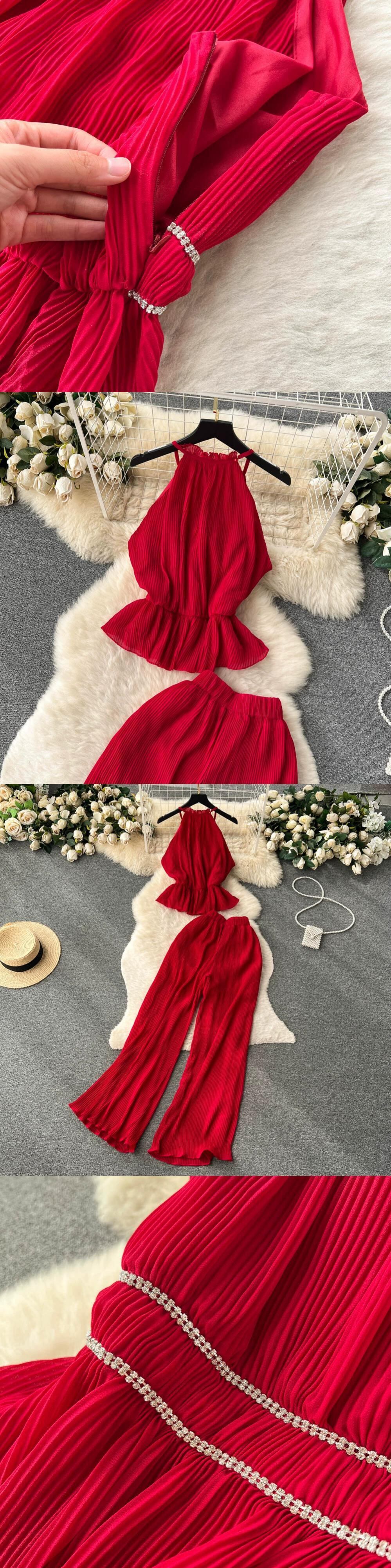 ライトラグジュアリーセレブスタイルファッションスーツレディースプリーツダイヤモンドスタッズホルターネックベスト+カジュアルハイウエストワイドレッグパンツ2点セット lyxaj92594605350