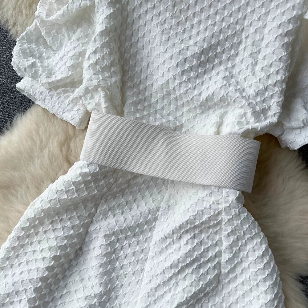 -end ファッションウエストテクスチャーパフスリーブジャンプスーツ女性の夏の新しいスリム V ネックウエストワイドレッグジャンプスーツ サマー 夏物 Vネック lyxaj31366468723