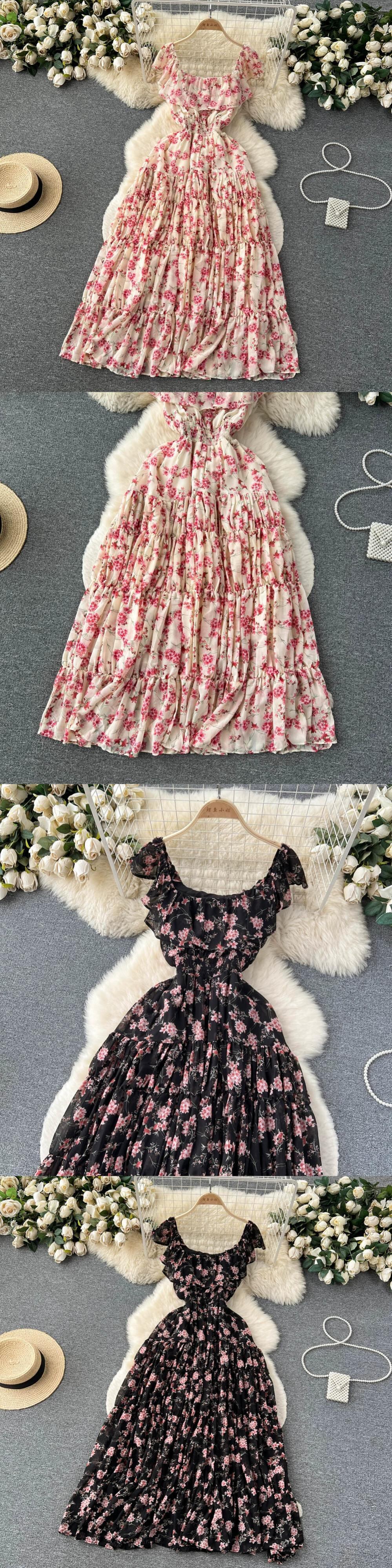 甘い欲望の雰囲気花柄小さなフライングスリーブドレス女性の夏のプリーツフリルニッチフレンチハイエンド桔梗スカート ラッフル 大人ガーリー スウィート キュート カジュアル サマー 夏物 フラワーデザイン lyxaj64303343803