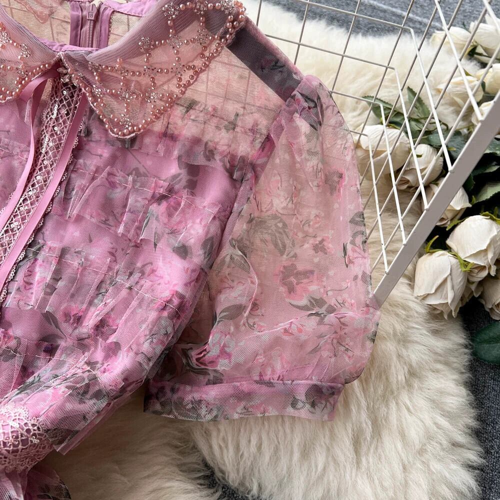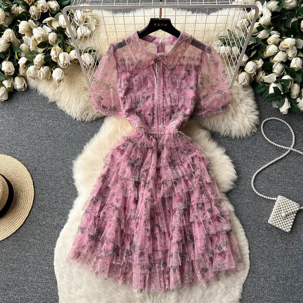 ライトラグジュアリーハイエンドビーズカラーフローラルケーキスカートレディーススリムウエストパフスリーブメッシュふわふわドレス 花柄 lyxaj79439990292