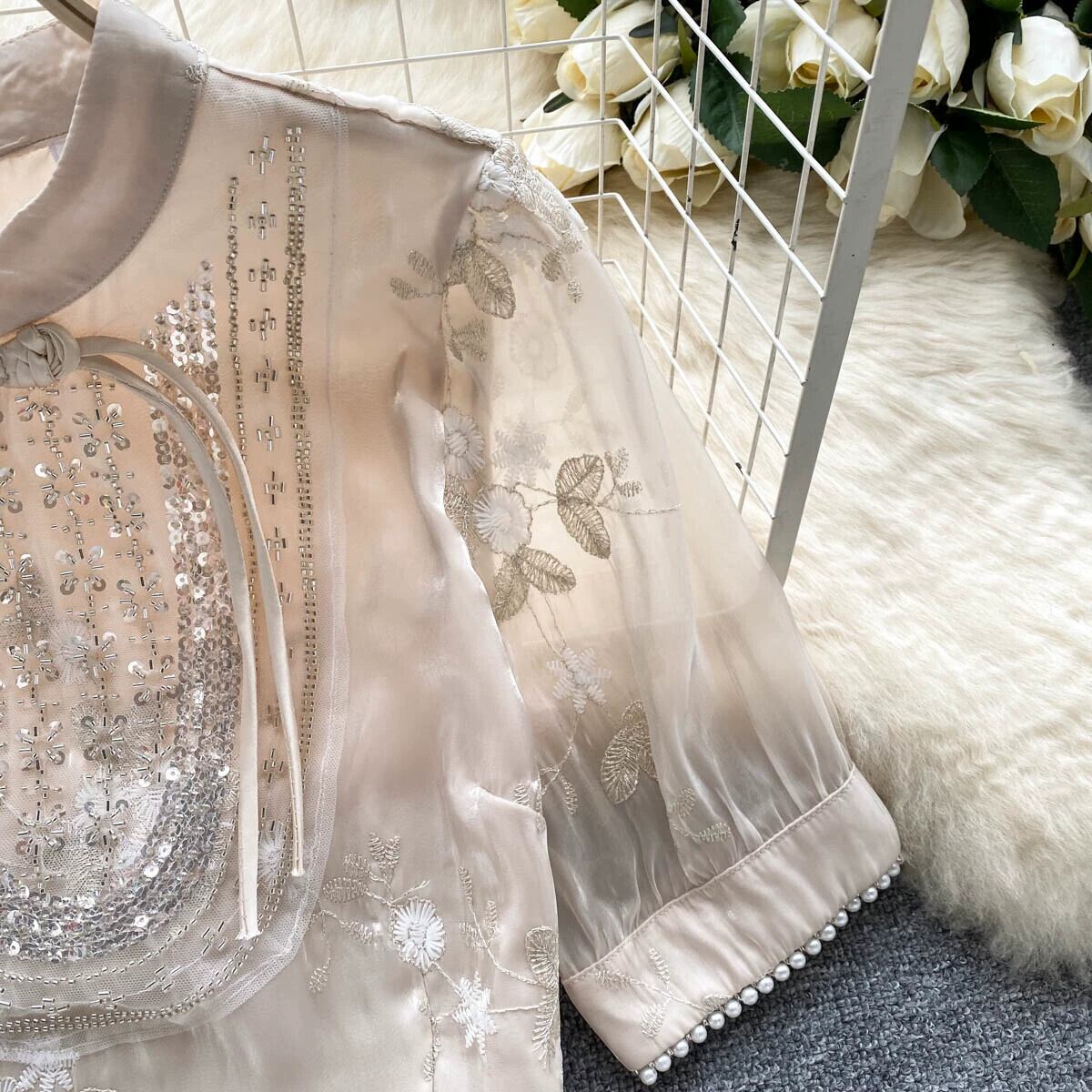 中国風国民風レトロバックルデザインスパンコール刺繍テルトップ+ハイウエストスリットスカートスーツ ハイウェスト lyxaj26767548382