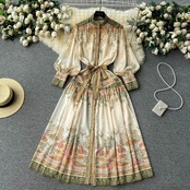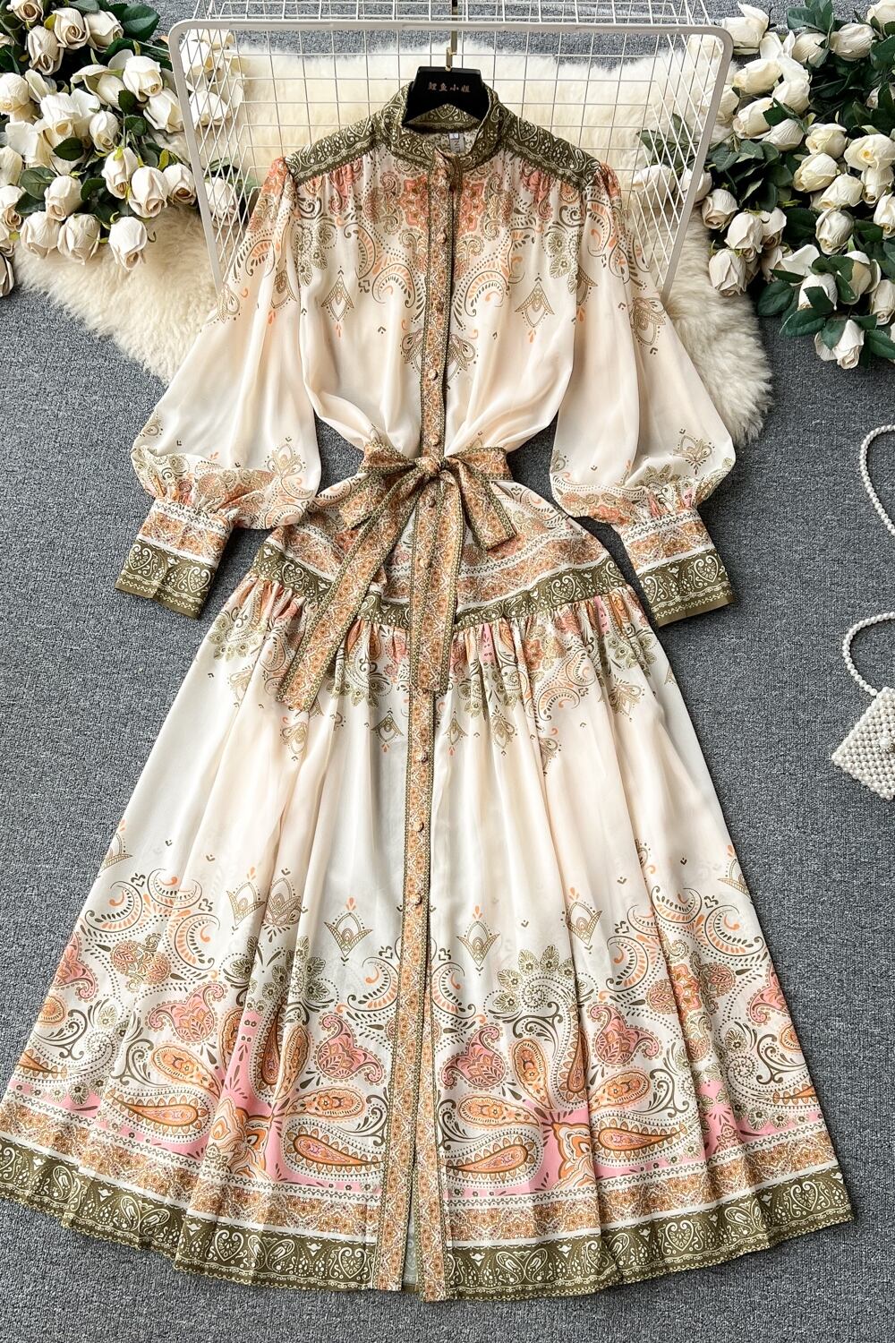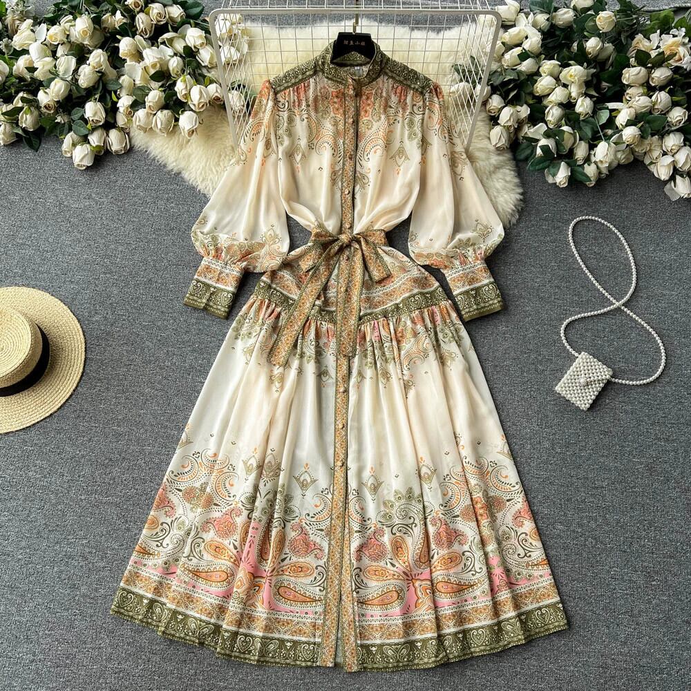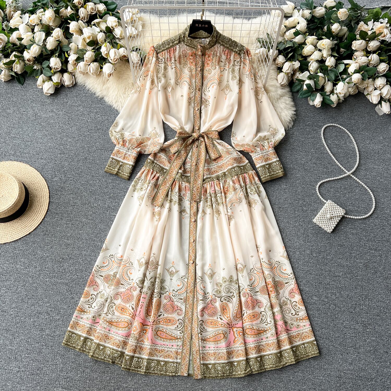 ヨーロッパとアメリカの裁判所レトロスタンドアップカラーランタンスリーブシングルブレストボタンアッププリントドレス女性のスリムウエストタイアップシャツドレス ヨーロピアン lyxaj63827765994