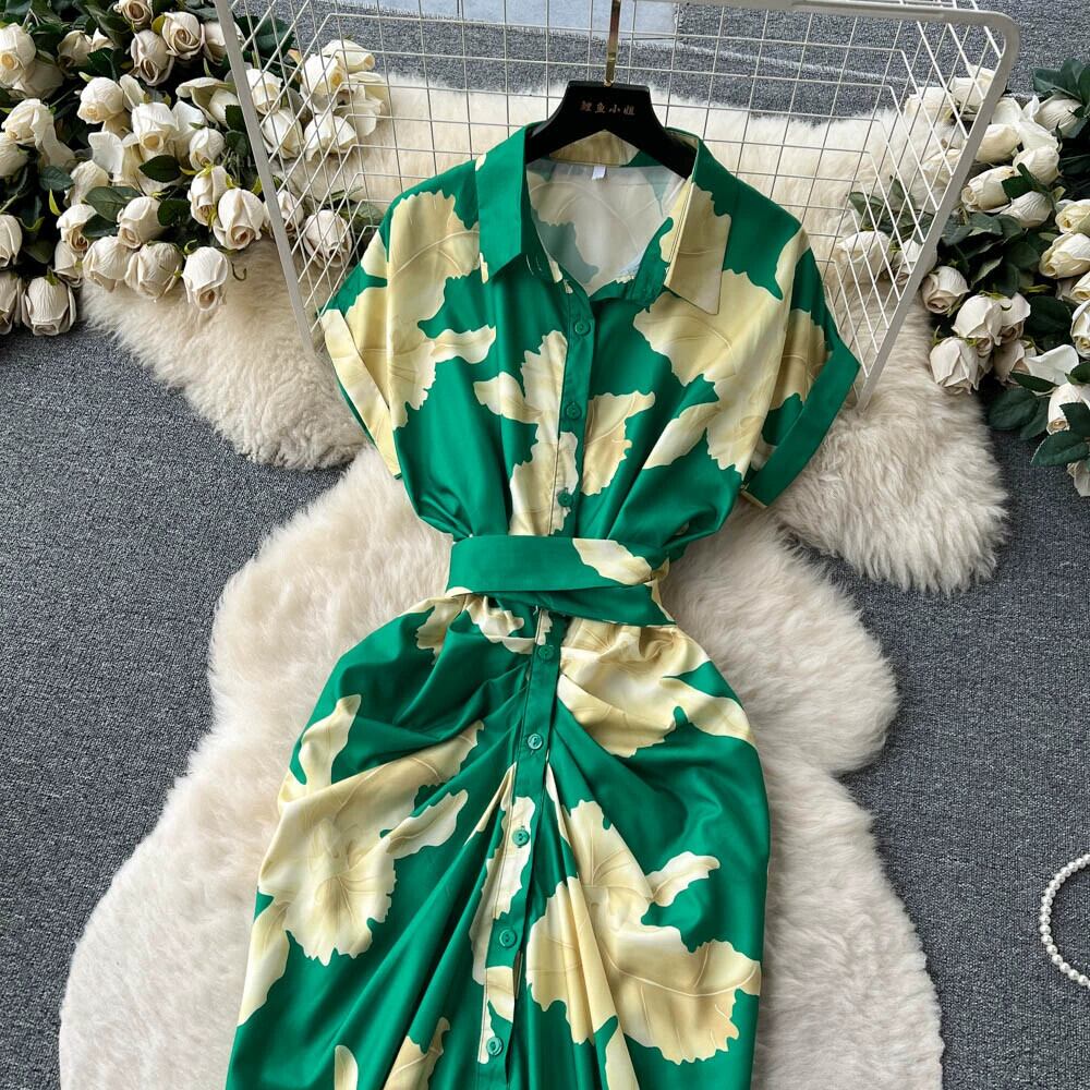 ヨーロッパとアメリカのレトロな軽くて馴染みのあるスタイルのラペルシングルブレストプリントドレス女性のプリーツネクタイウエストウエストスリム気質ロングスカート ヨーロピアン lyxaj27596918754