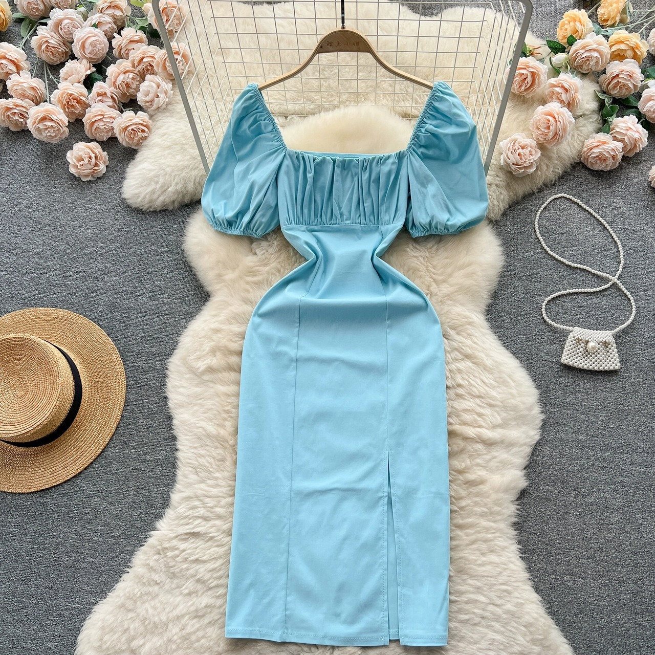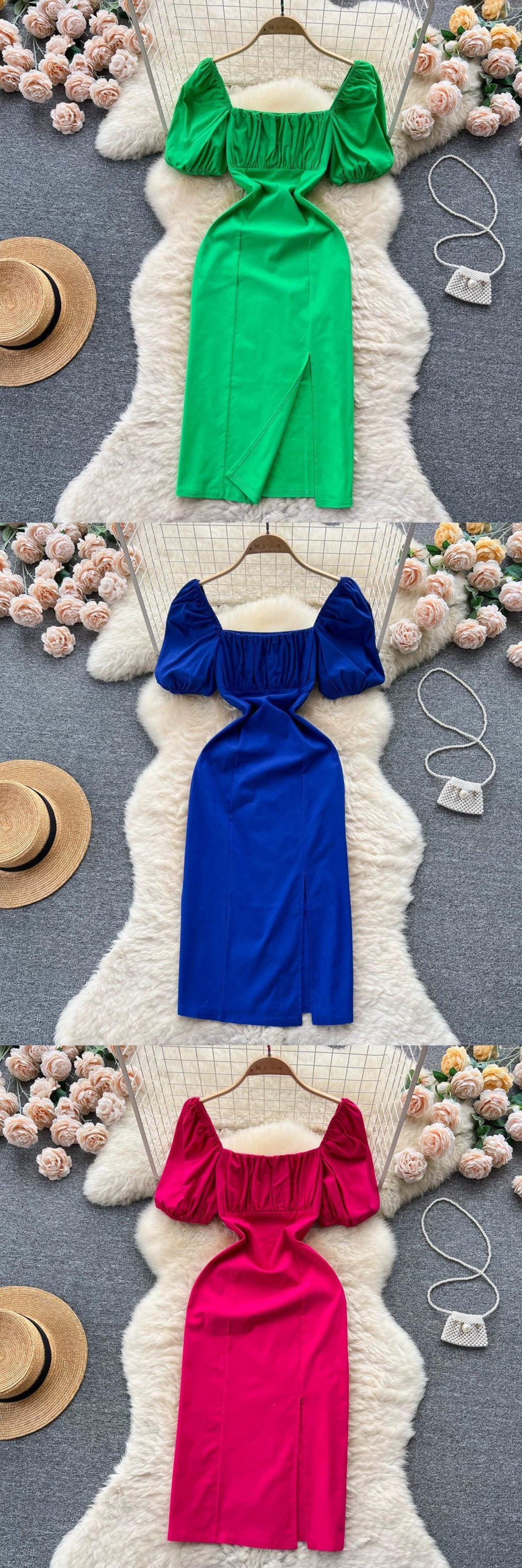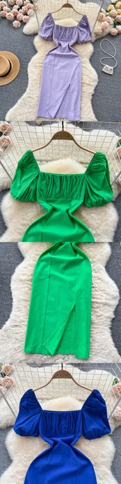 フレンチレトロスクエアカラープリーツパフスリーブドレスレディースハイウエストスリム気質デザインセンススリットバッグヒップドレス ハイウェスト スクウェア lyxaj80936228806