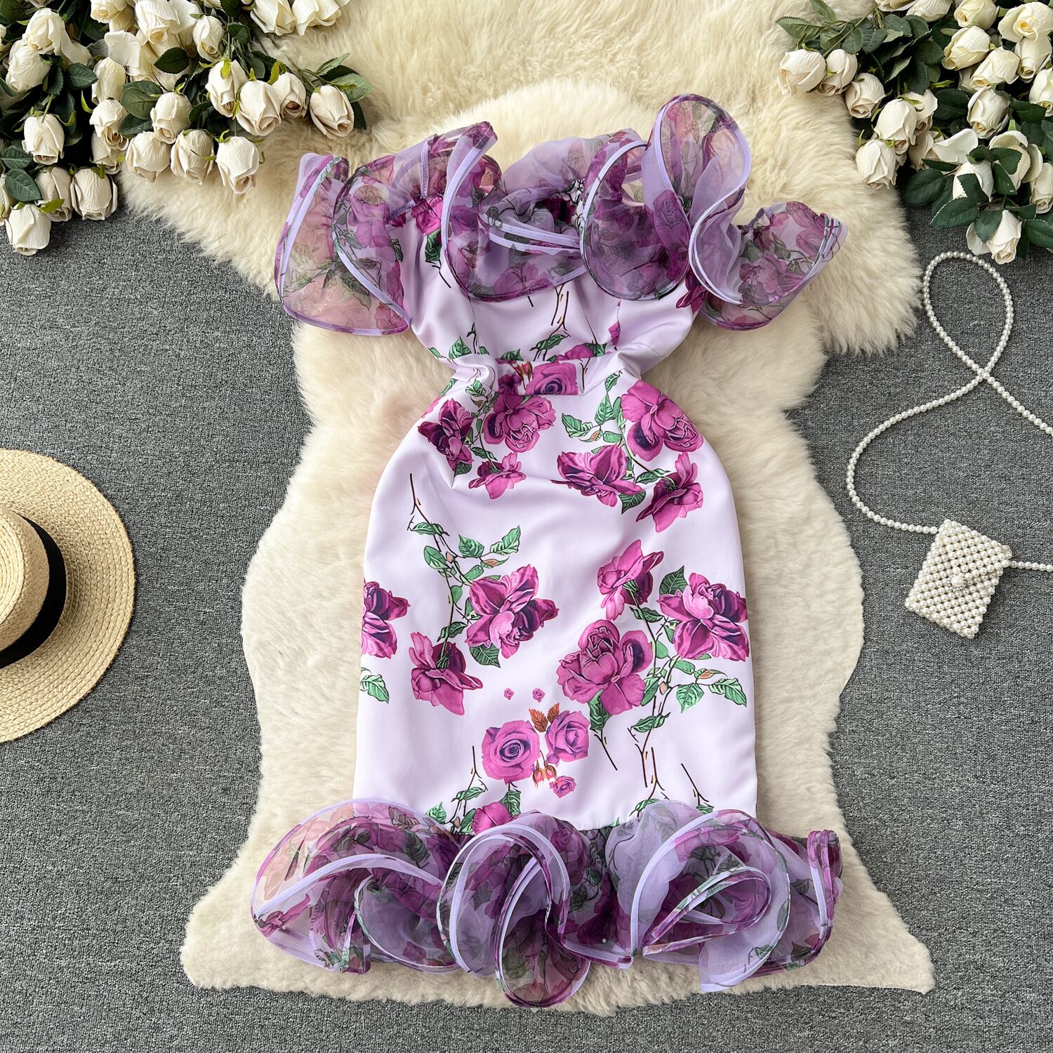夏ニッチデザインセンス立体フラワースプライシングメッシュドレス女性のプリントウエストスリムバッグヒップスカートトレンディ サマー 夏物 フラワーデザイン lyxaj4049811269