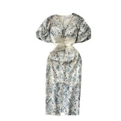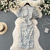 セレブの高級ドレス宴会スカート女性の夏スリムフィットメッシュステッチパフスリーブスリットバッグヒップ花柄ドレス サマー 夏物 lyxaj95365871094