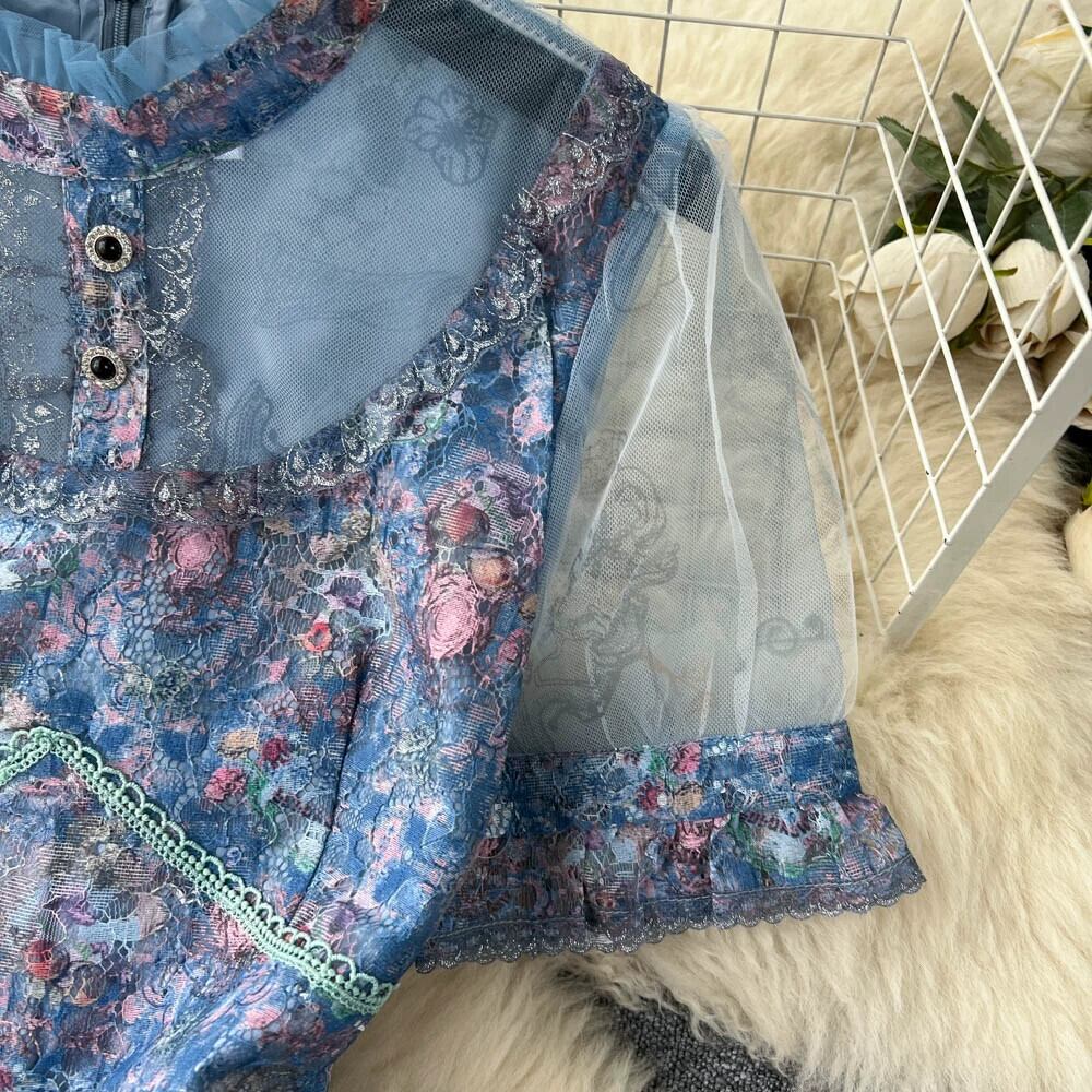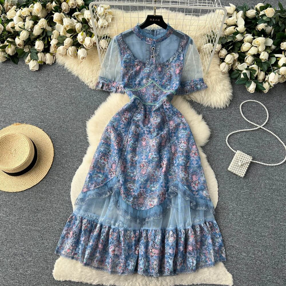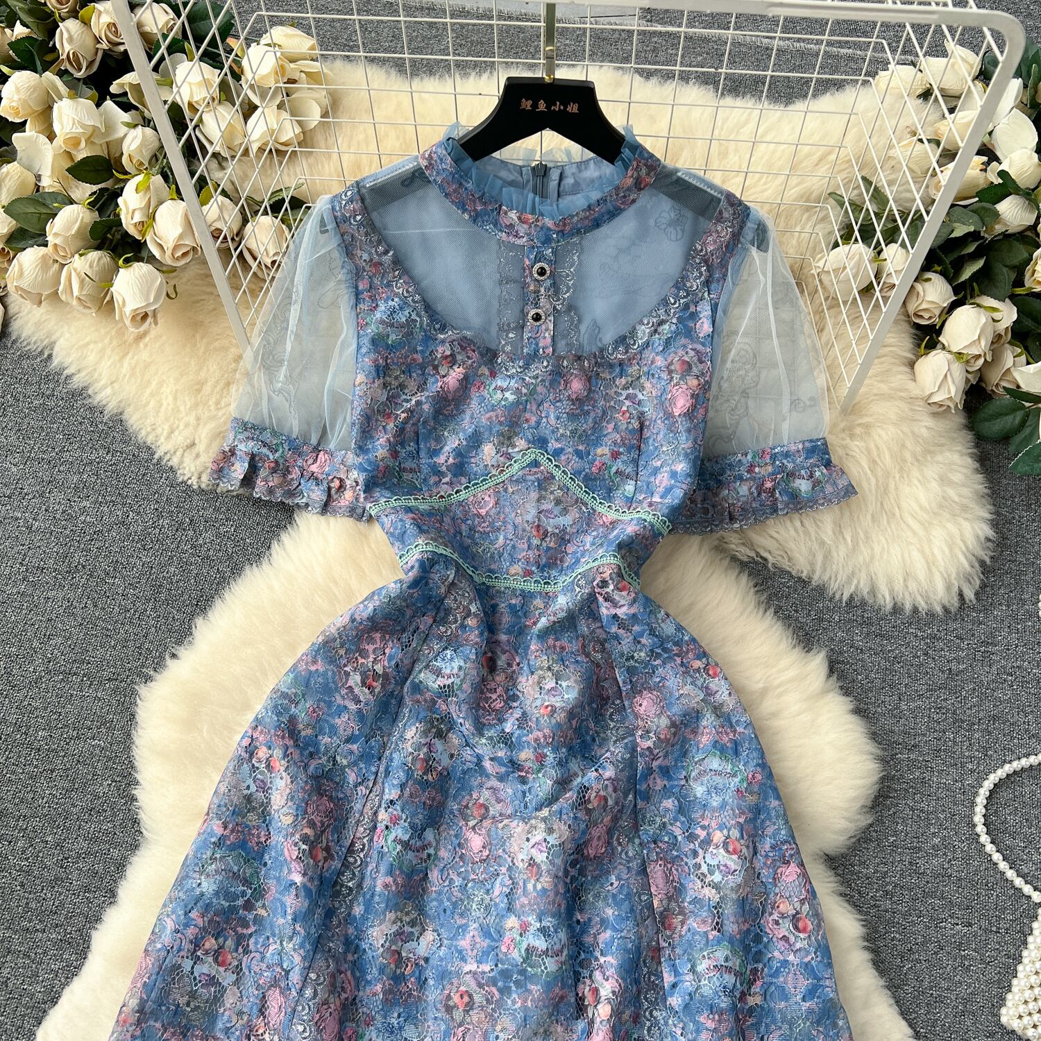 フレンチレトロスタンドアップカラー半袖プリントメッシュステッチ花柄ドレス女性ウエストデザインエレガントなaラインスカート lyxaj47900974660