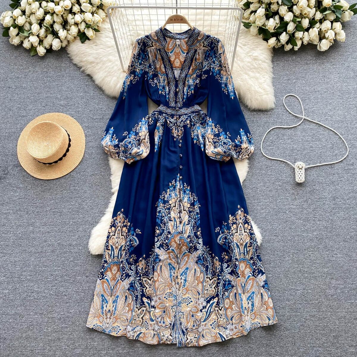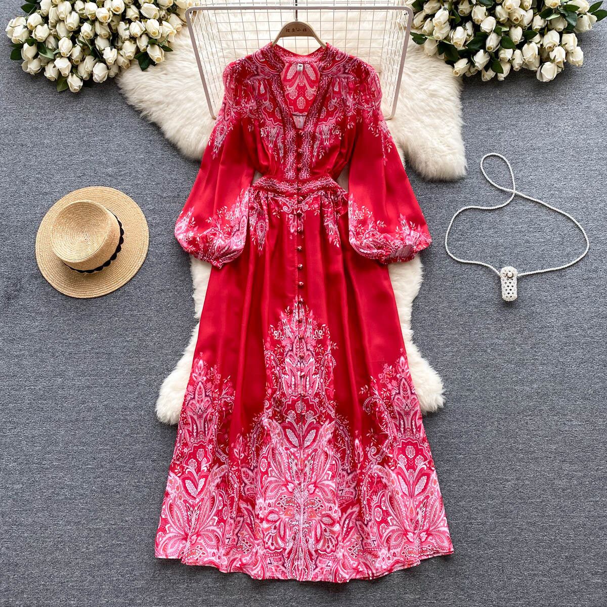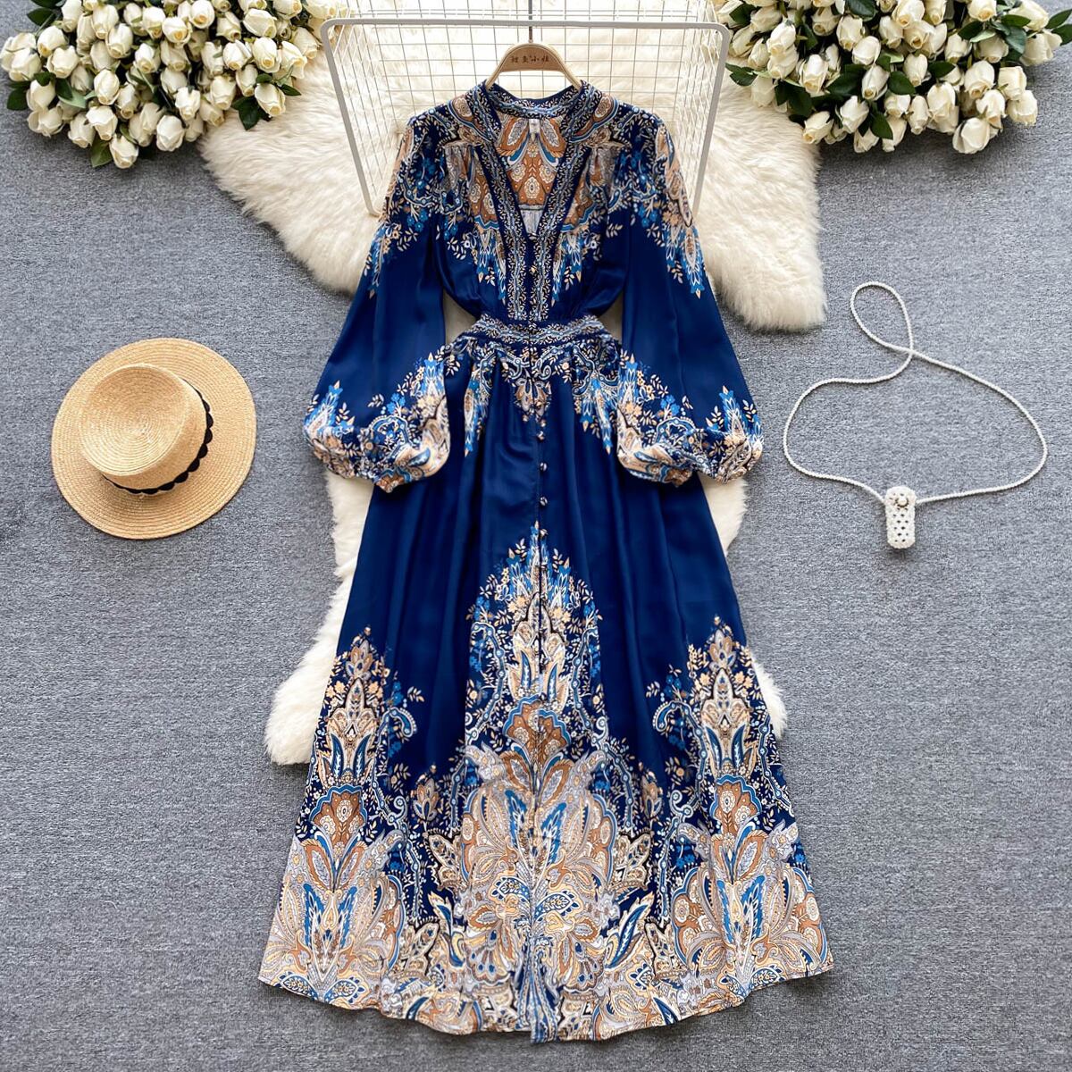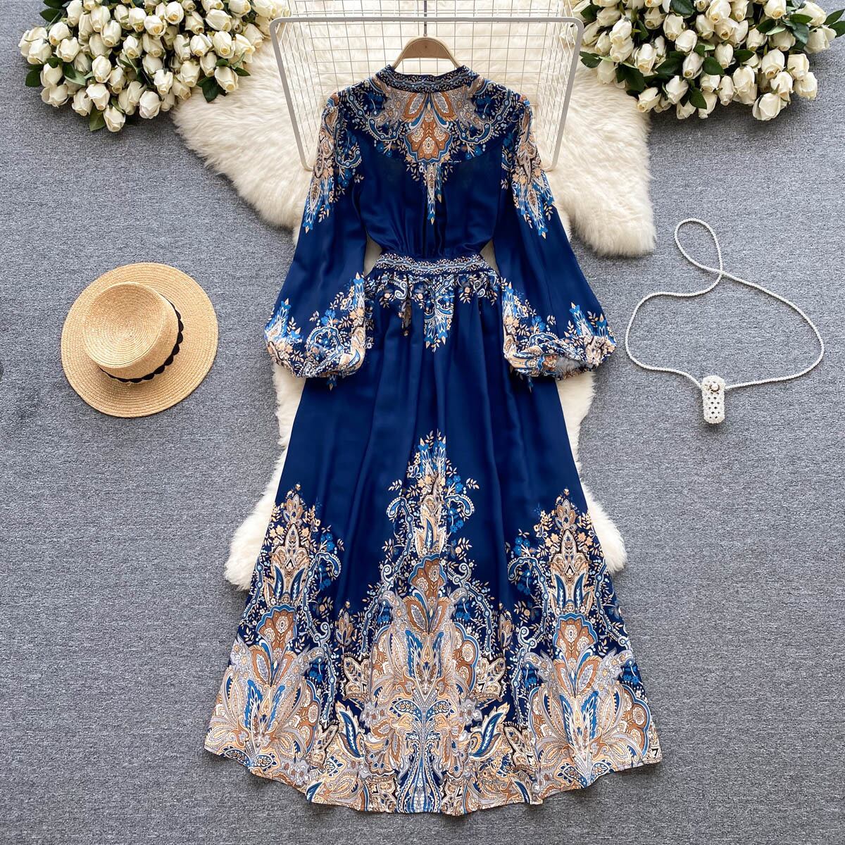 ヨーロッパとアメリカの裁判所のレトロなスタイルのランタンスリーブシングルブレストシャツスカート女性の夏のカラーマッチングプリントビッグスイングロングドレス サマー 夏物 ヨーロピアン lyxaj382481119