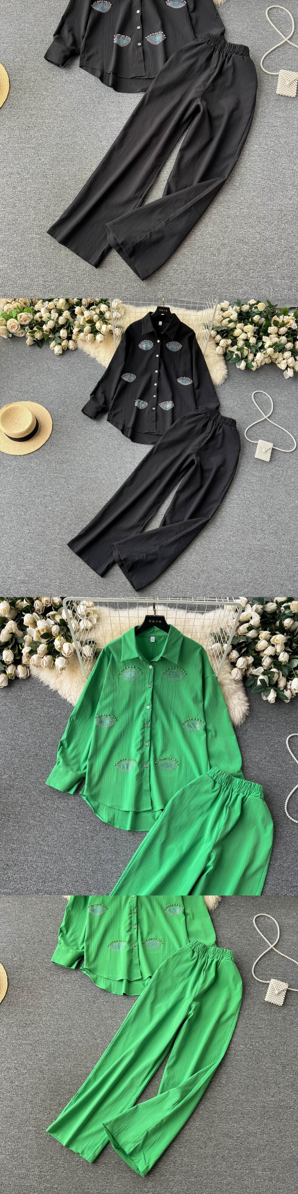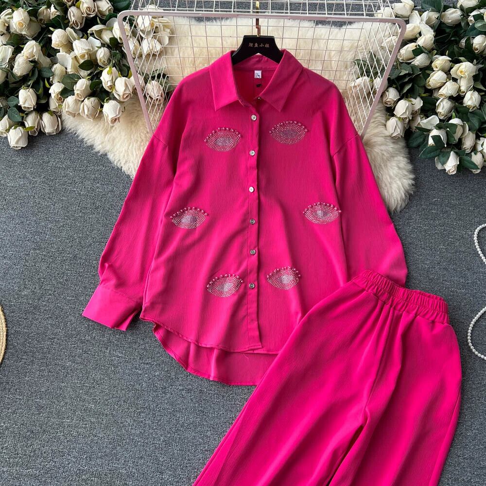 個性、年齢軽減ニッチデザイン、高級無地シャツ、eign style、年齢軽減、細身、ウエストゴム、ワイドパンツ、2点セット エラスティック 伸縮 ソリッドカラー lyxaj1280587393
