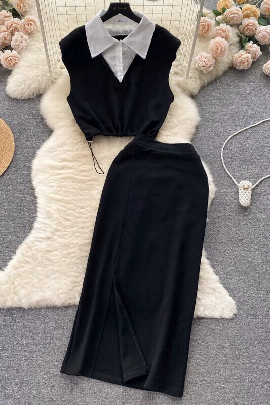 カジュアルスーツ レディース 夏 ショートラペル ノースリーブ トップス ハイウエスト バッグ ヒップ スリット スカート 2点セット ハイウェスト サマー 夏物 lyxaj94288431172