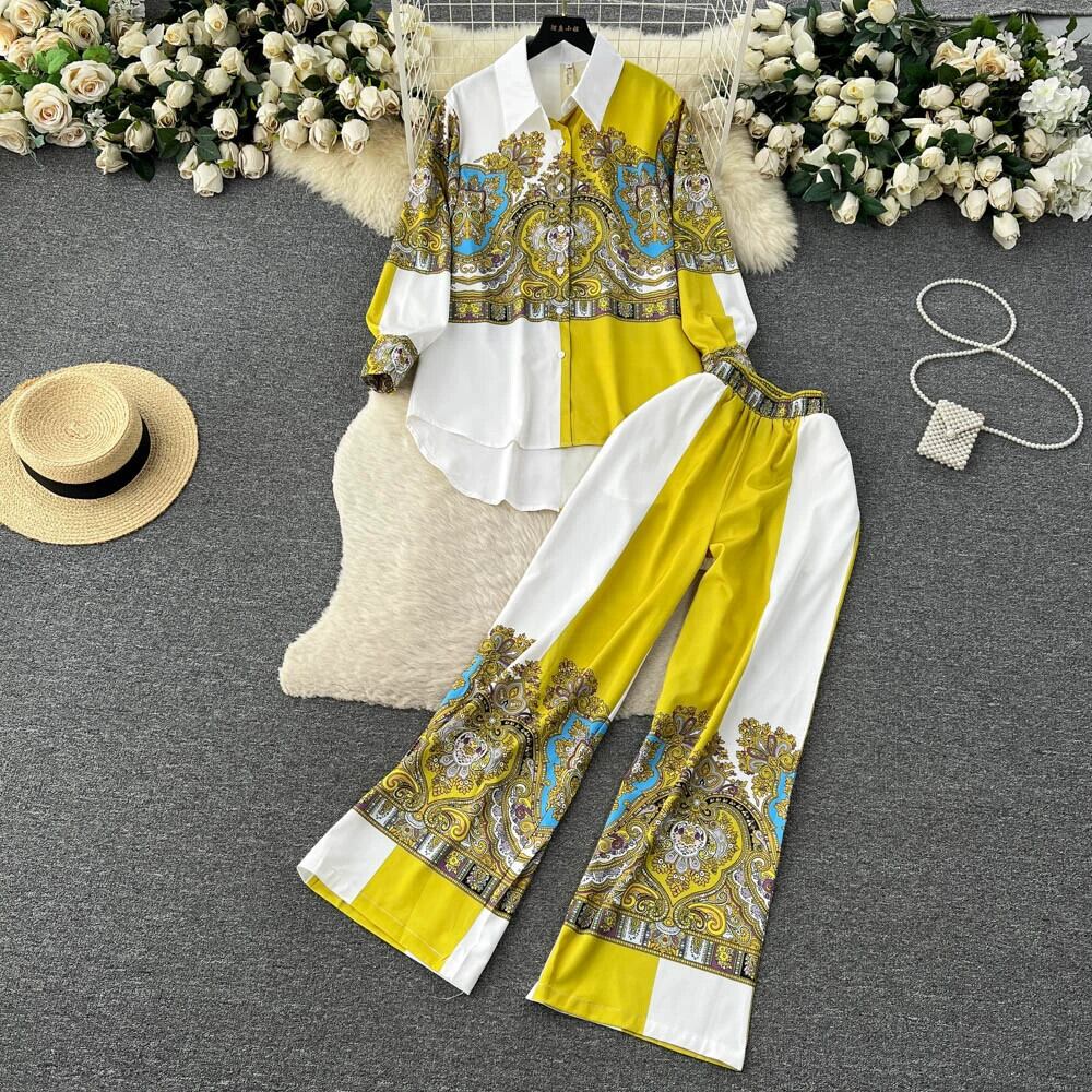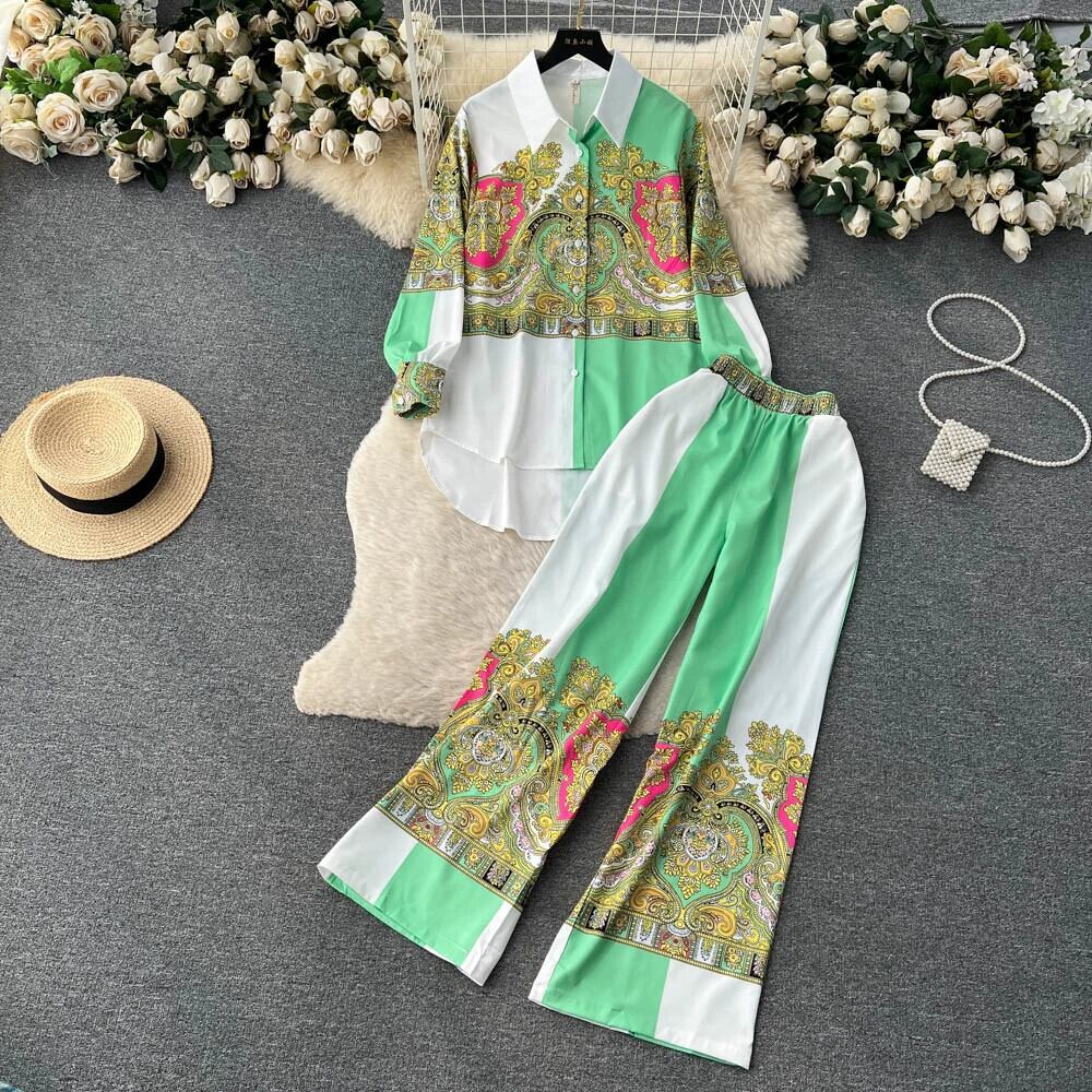 フレンチデザインルーズ長袖シングルブレストシャツ+ハイウエストスリムワイドレッグパンツファッションプリント2点セット ロング lyxaj12550286685