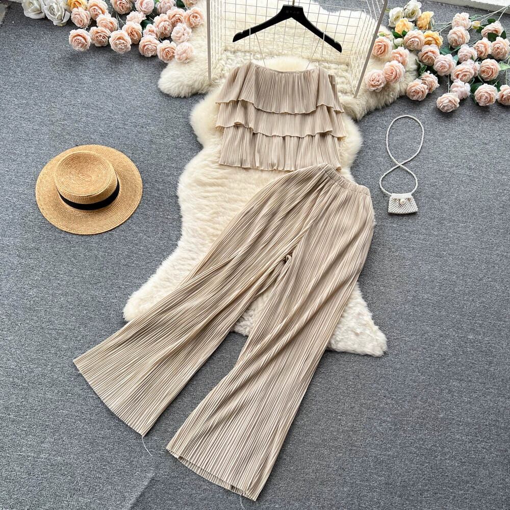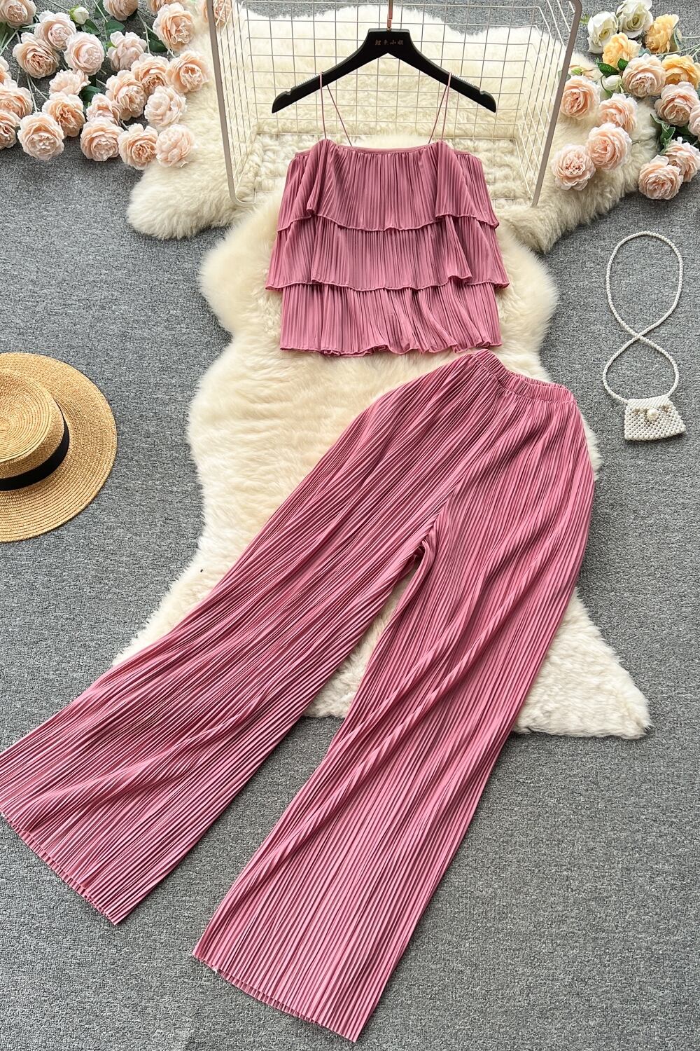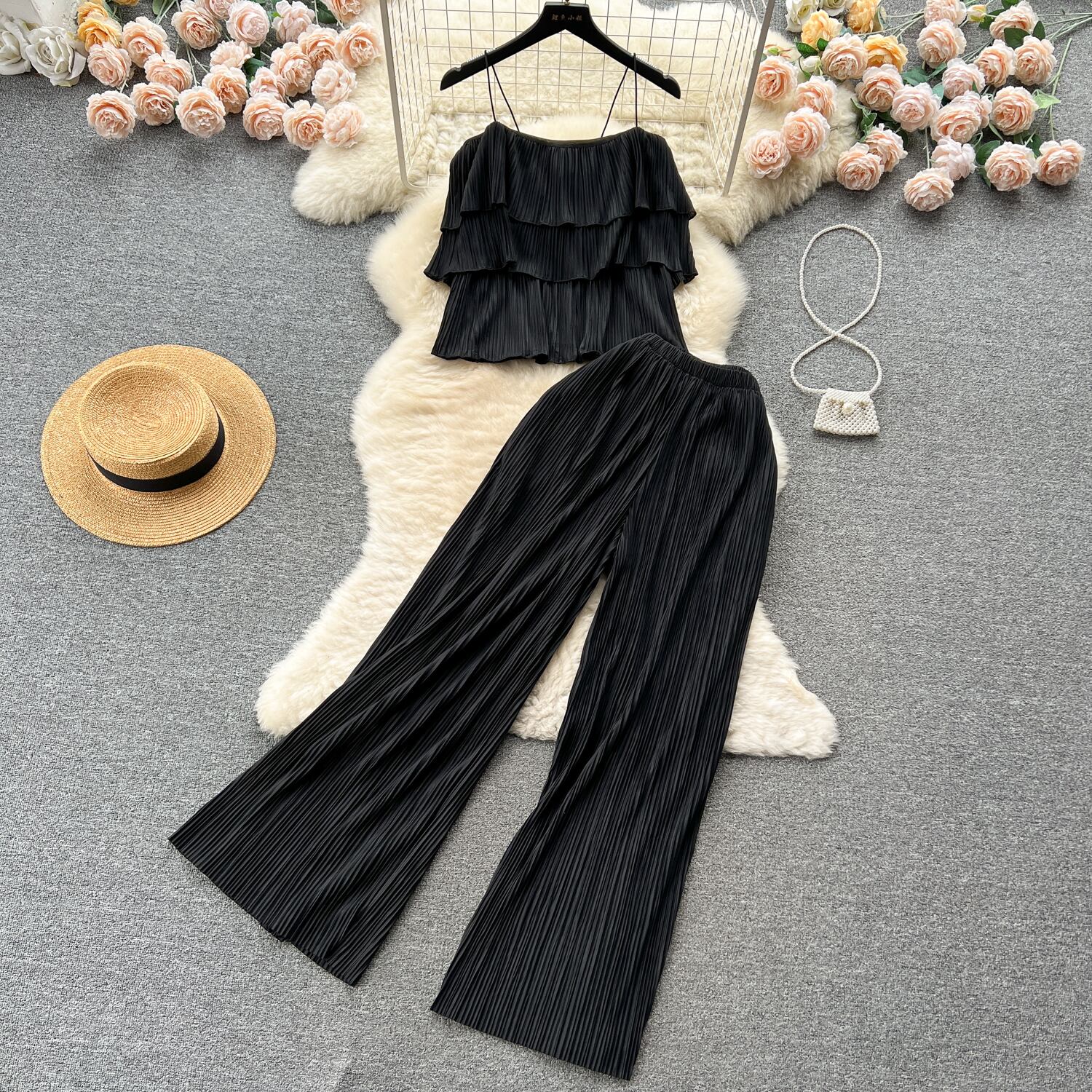 やや太くて細いスーツのレディースサマードレス2023新作甘いフリルサスペンダートップ万能ワイドパンツ2点セット 大人ガーリー スウィート キュート カジュアル 夏物 lyxaj63468810325