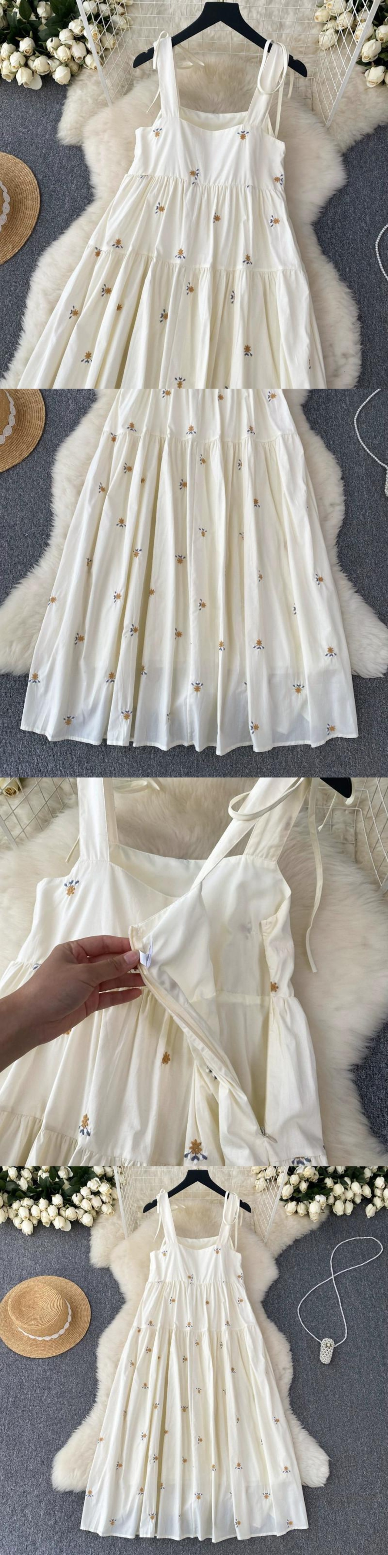 フレンチスタイルの優しい風小さな新鮮な花の刺繍ストラップドレスレディース夏ルーズAラインビッグスイングホリデードレス レッド サマー 夏物 フラワーデザイン lyxaj40345290815