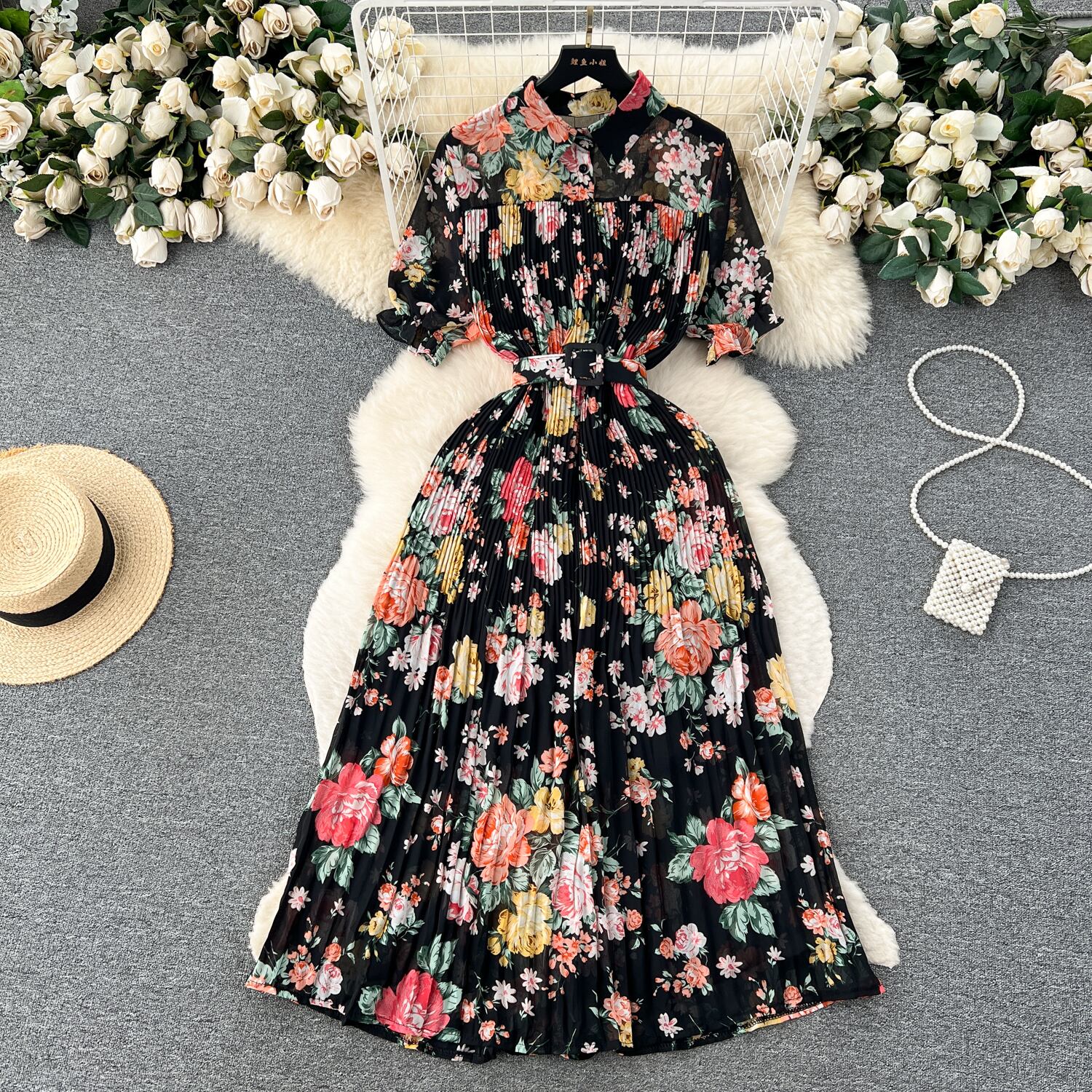 夏の海辺の休日スタイル花柄シフォンスカート女性のレースアップウエスト痩身気質ラペル半袖プリーツドレス サマー 夏物 lyxaj16926726080