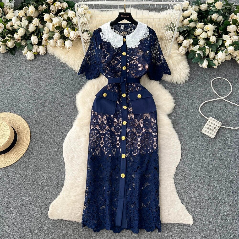 夏の新しいハイエンドドレスダークブルー重いレースコントラストカラー人形の襟エレガントな気質の薄いドレス サマー 夏物 lyxaj68062213417