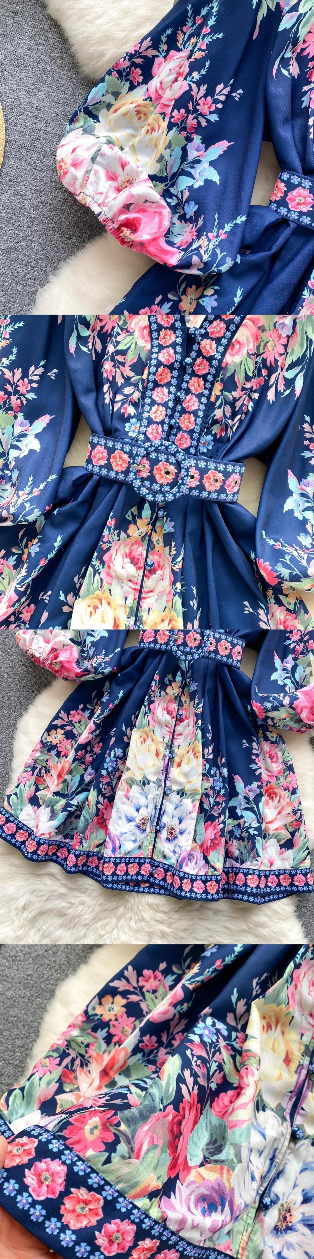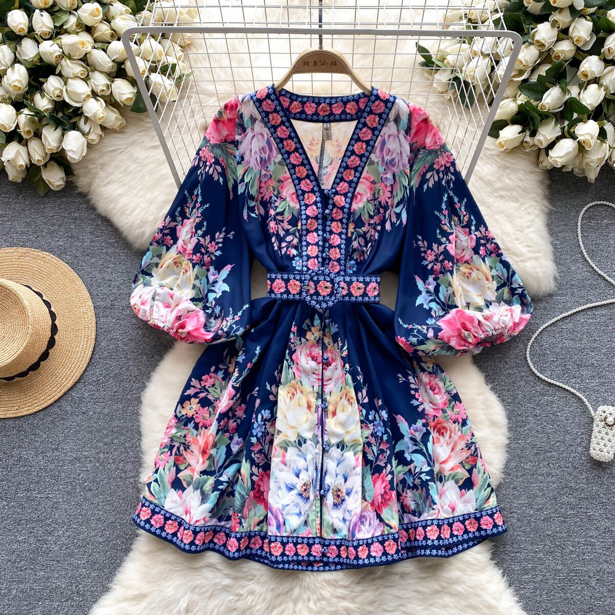 夏の新しいニッチデザインセンスポジショニングプリントVネックドレス女性ウエストマッチングカラーマッチング海辺の休日Aラインスカート サマー 夏物 lyxaj36167023918