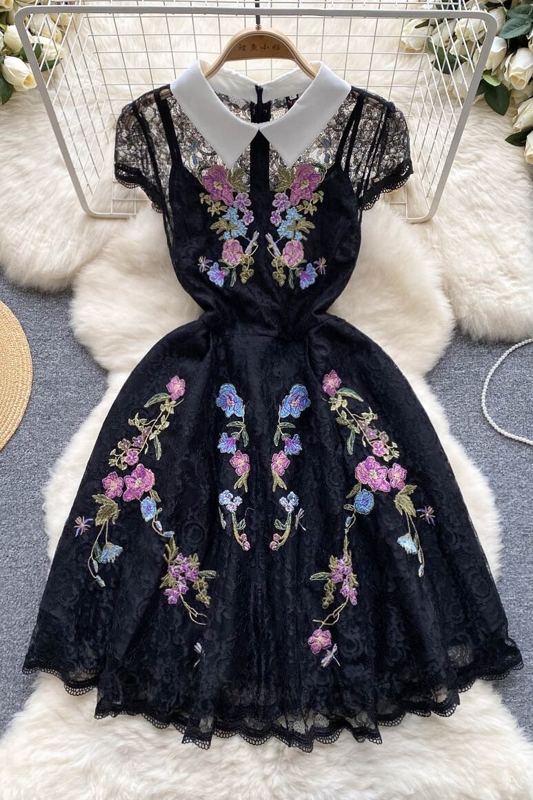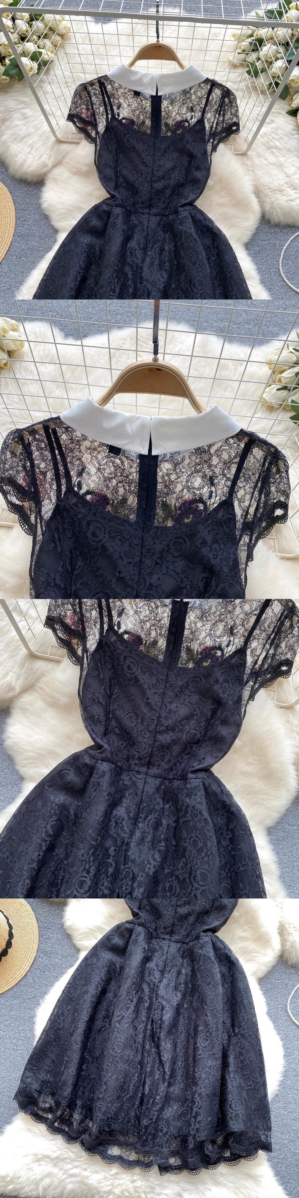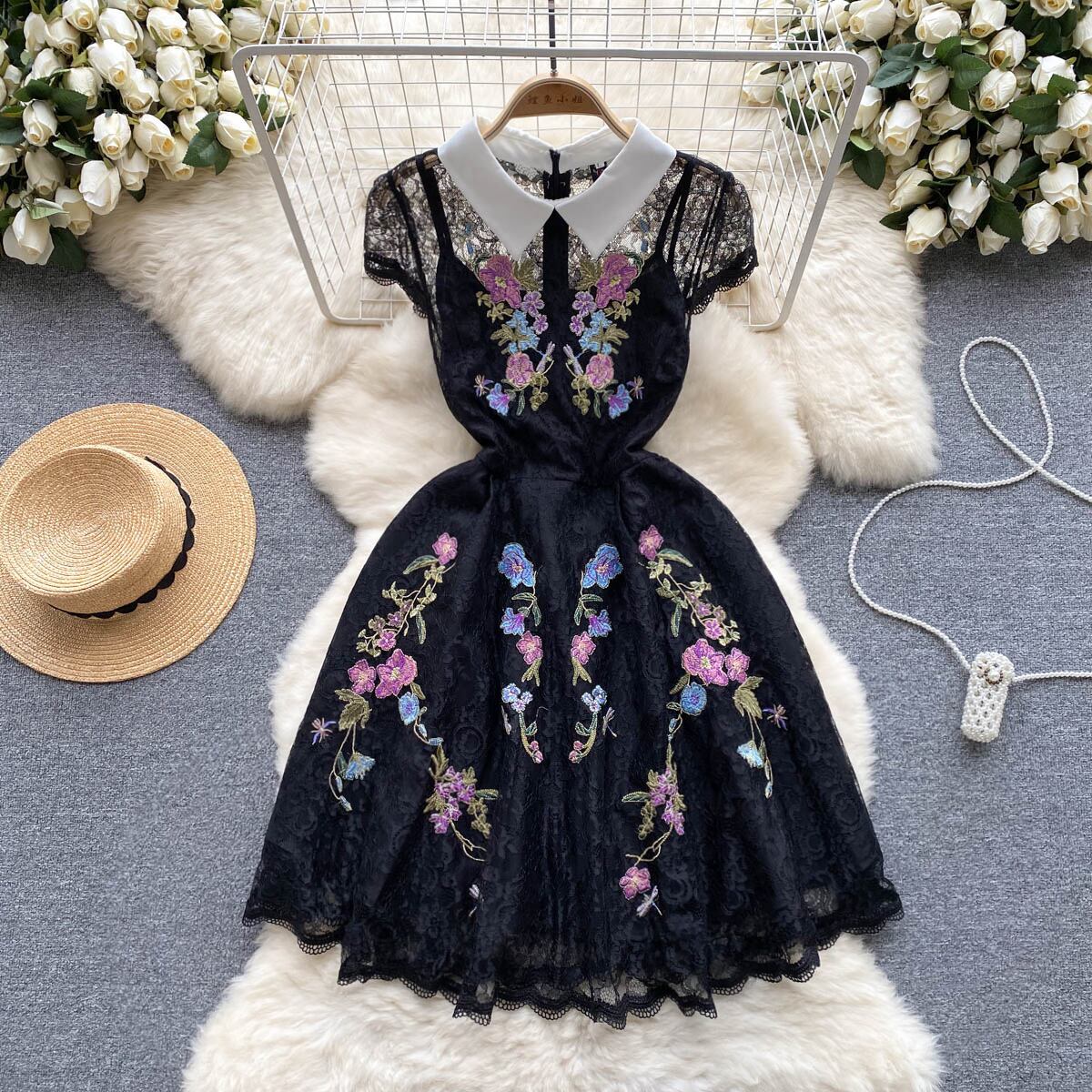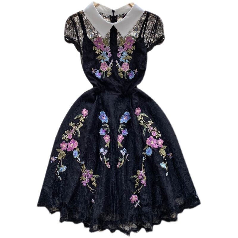 ヨーロッパとアメリカのレトロな宮殿スタイルのハイエンド刺繍レース大振りスカート人形襟半袖ウエスト痩身レースドレス ショート ハーフスリーブ ヨーロピアン lyxaj66936235970