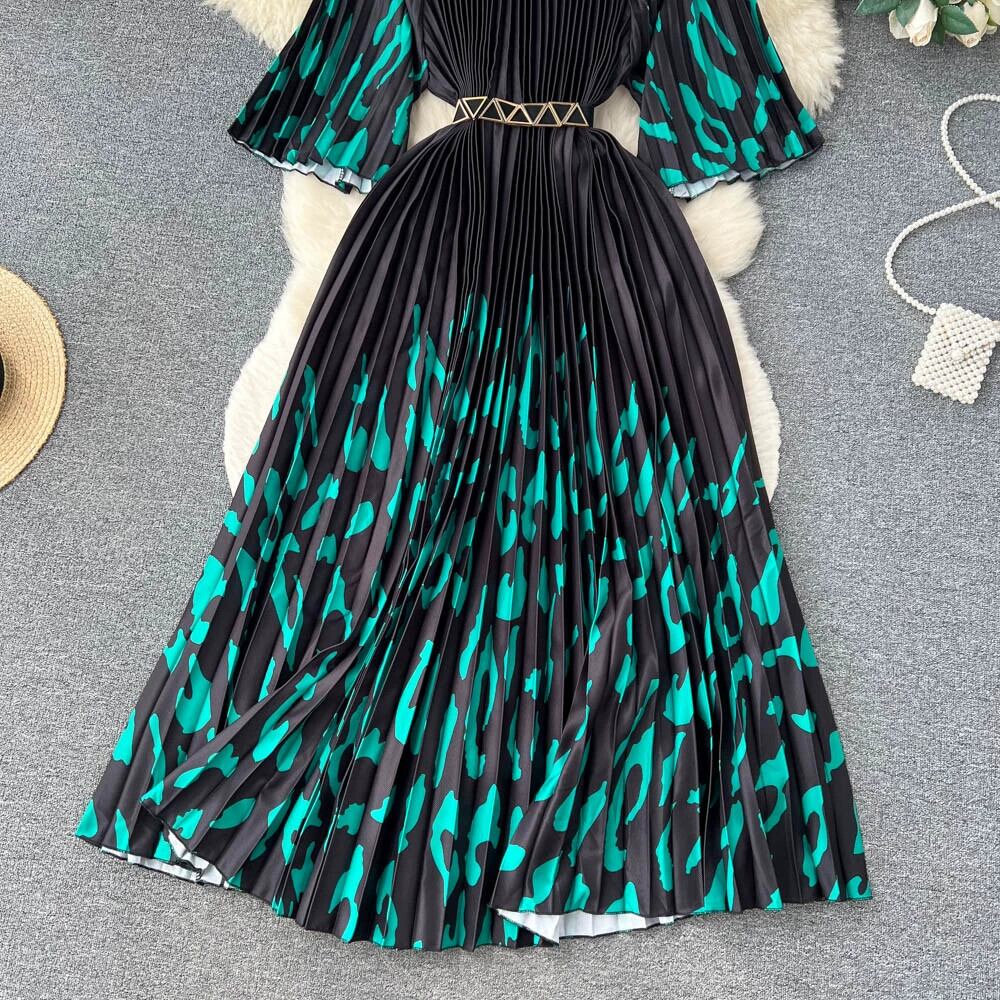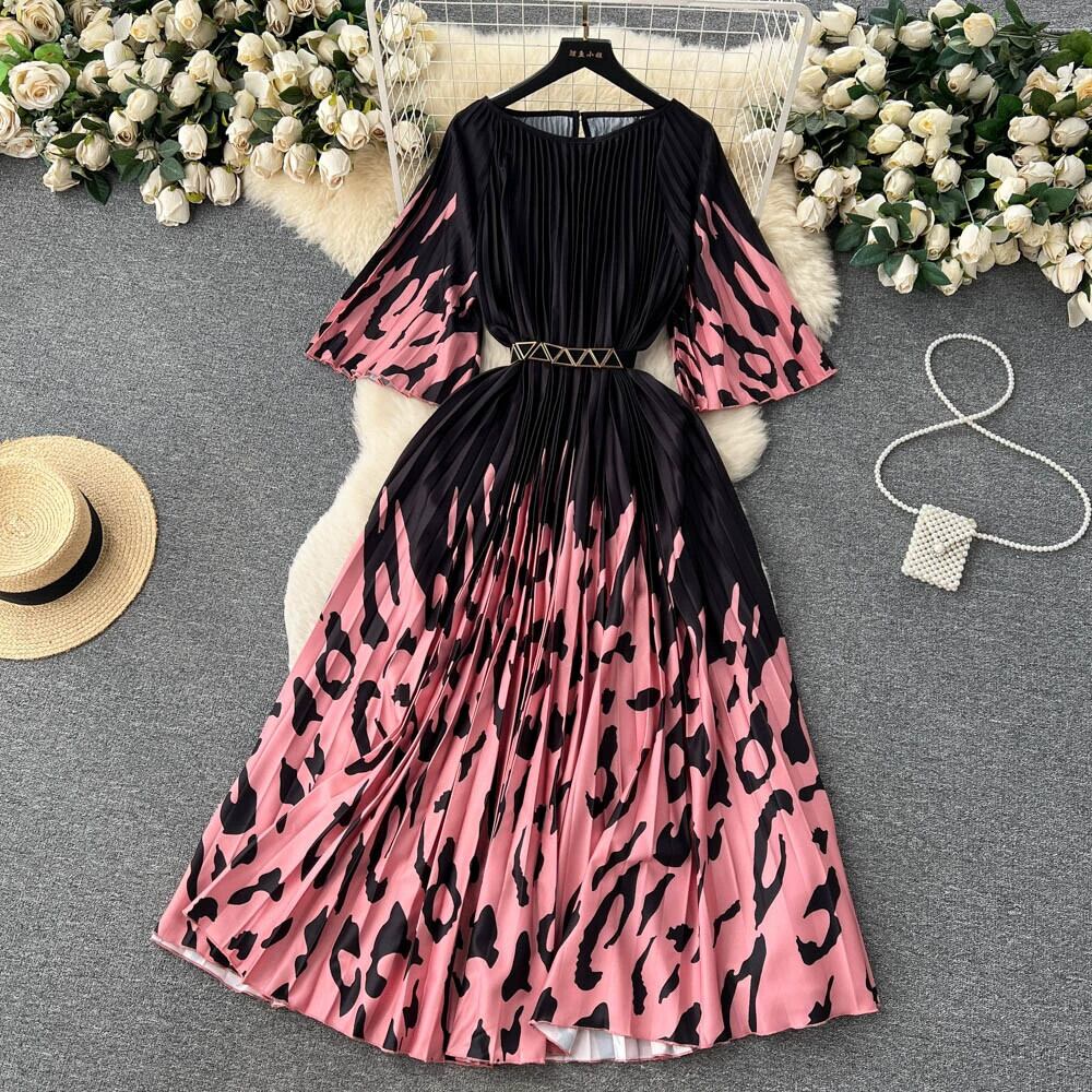 夏の新しい eign スタイル年齢削減カラーマッチングプリーツラウンドネックドレス女性のウエスト痩身ロングセクション大きなスイングビーチスカート潮 サマー 夏物 Oネック lyxaj5294950946