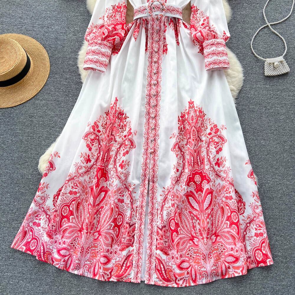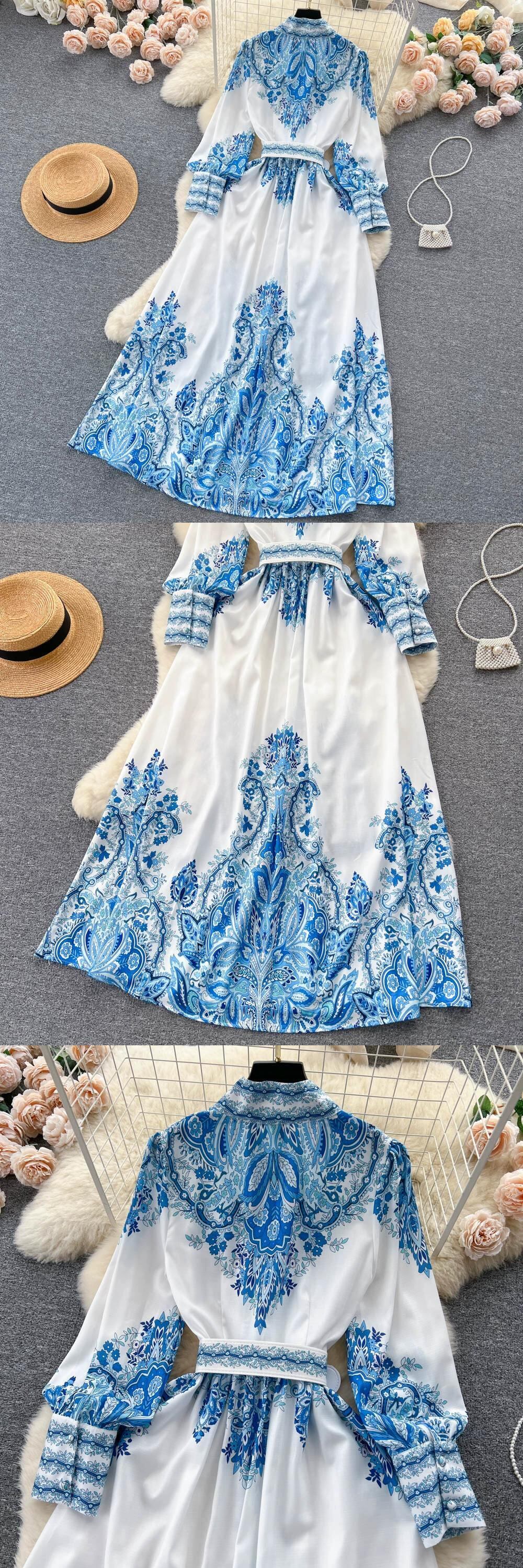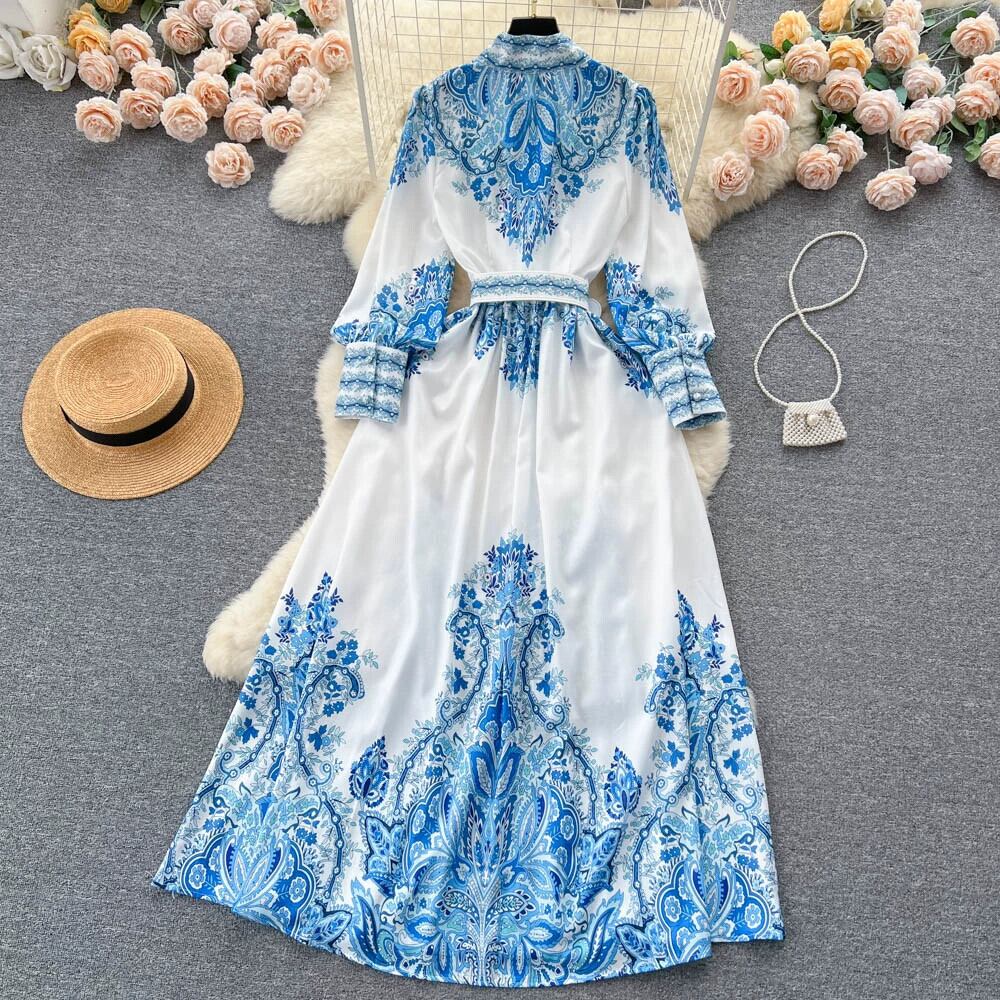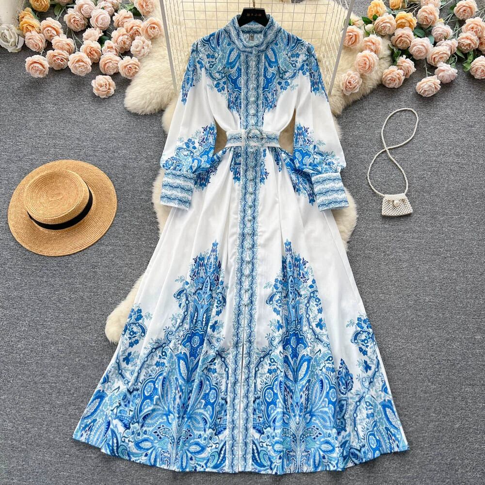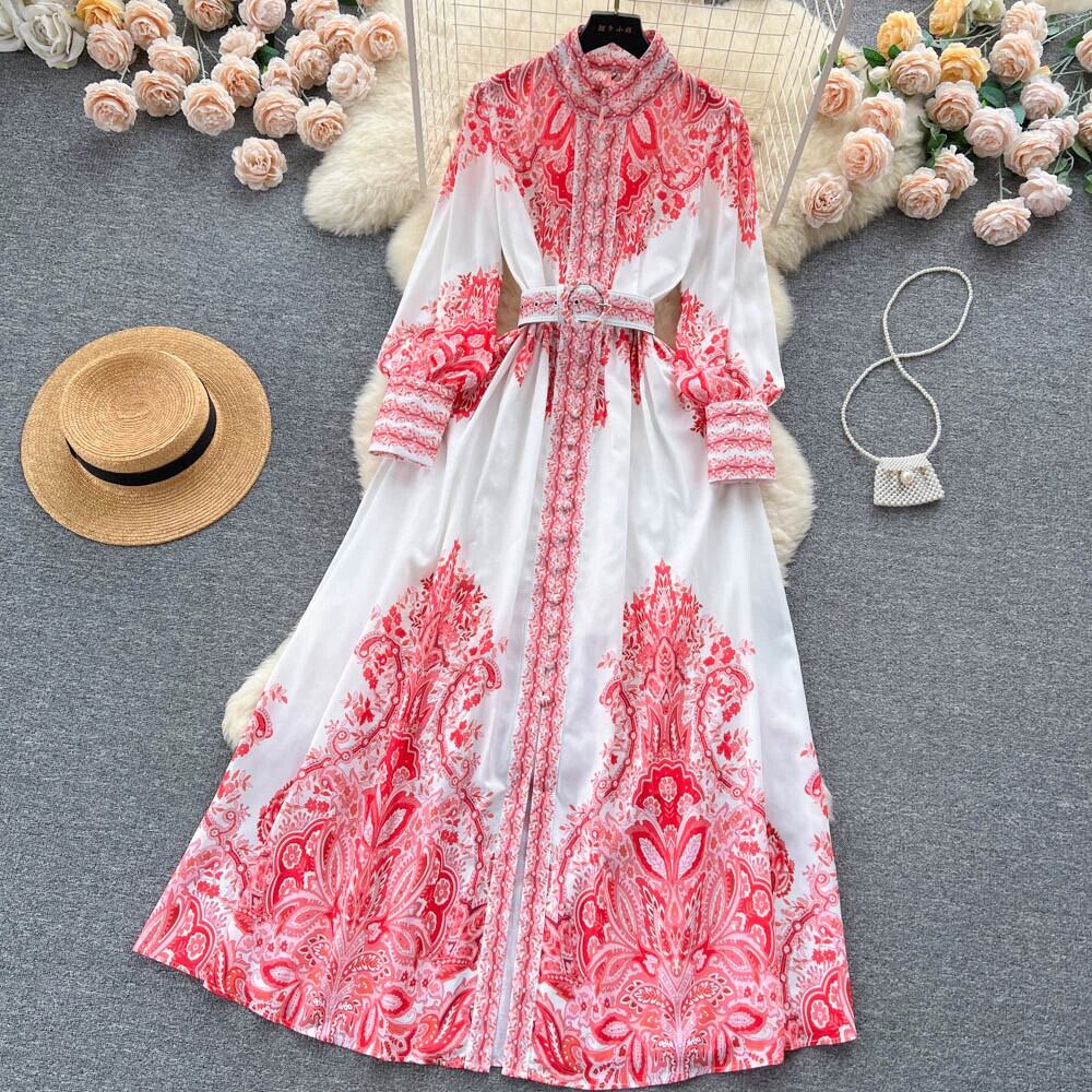 フレンチレトロ宮廷風ハイエンドスタンドカラーシングルブレストボタンウエスト着痩せAライン大振りプリントドレス lyxaj15248295686