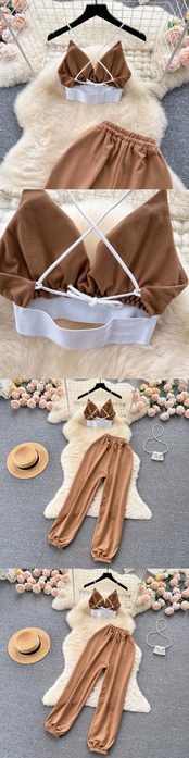 Pure Desire Spice Girls セクシーな背中の開いたラップチェストサスペンダートップニッチウエストスリム薄型レースアップワイドレッグパンツ 2 点セット lyxaj60312792892