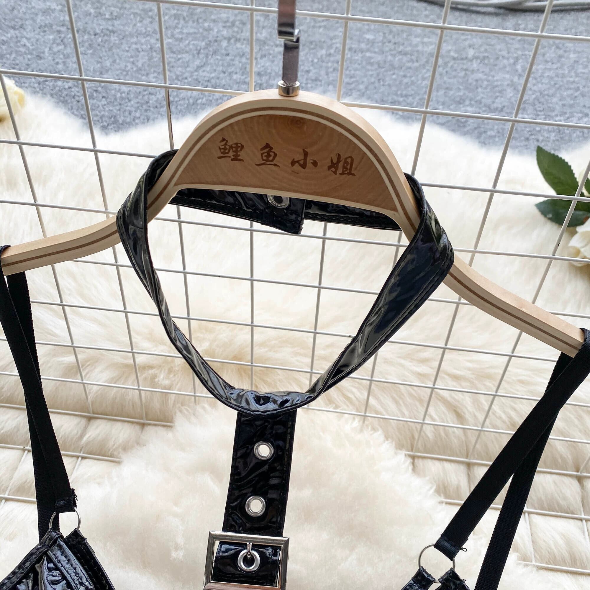 ヨーロッパとアメリカの ins スタイルのデザインセンス巾着ネクタイ中空メッシュスプライシング PU レザーセクシーな吊りネックスリングジャンプスーツトレンディな ヨーロピアン lyxaj66657411362