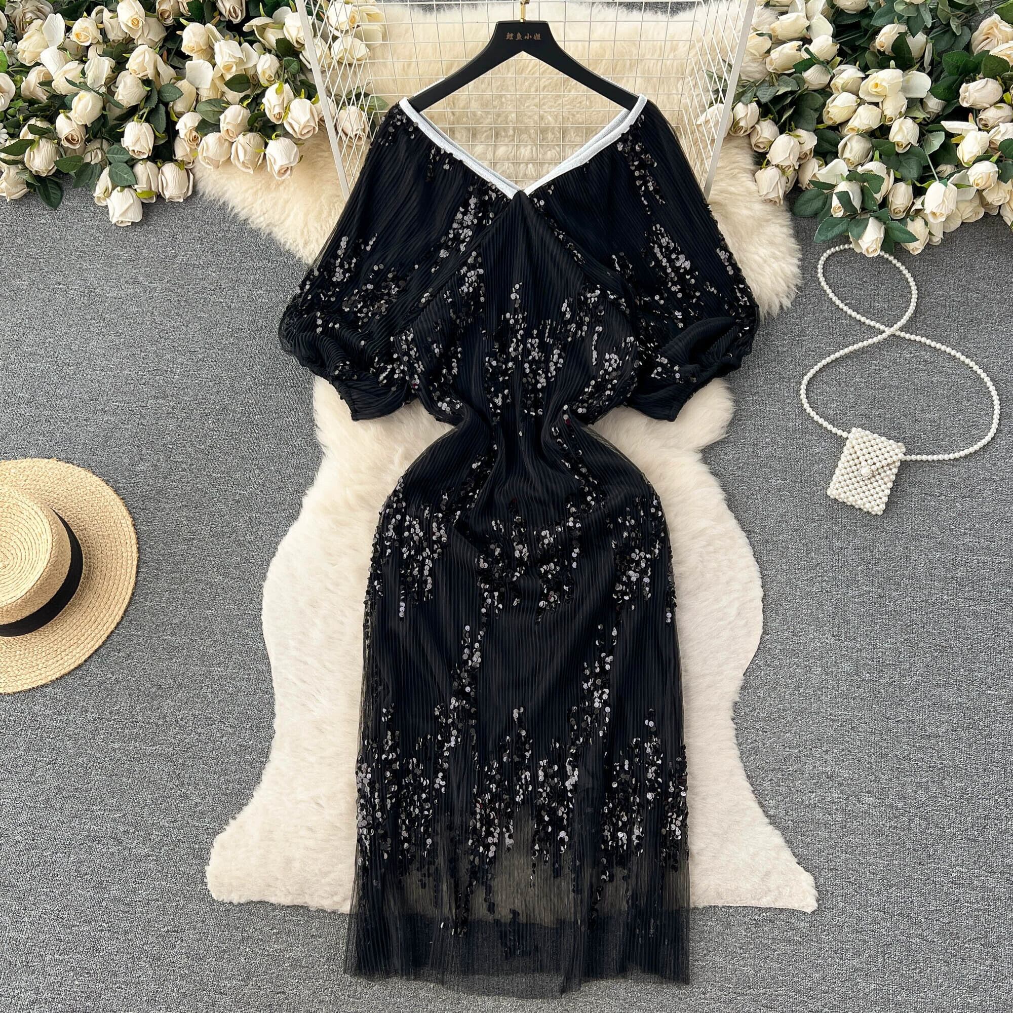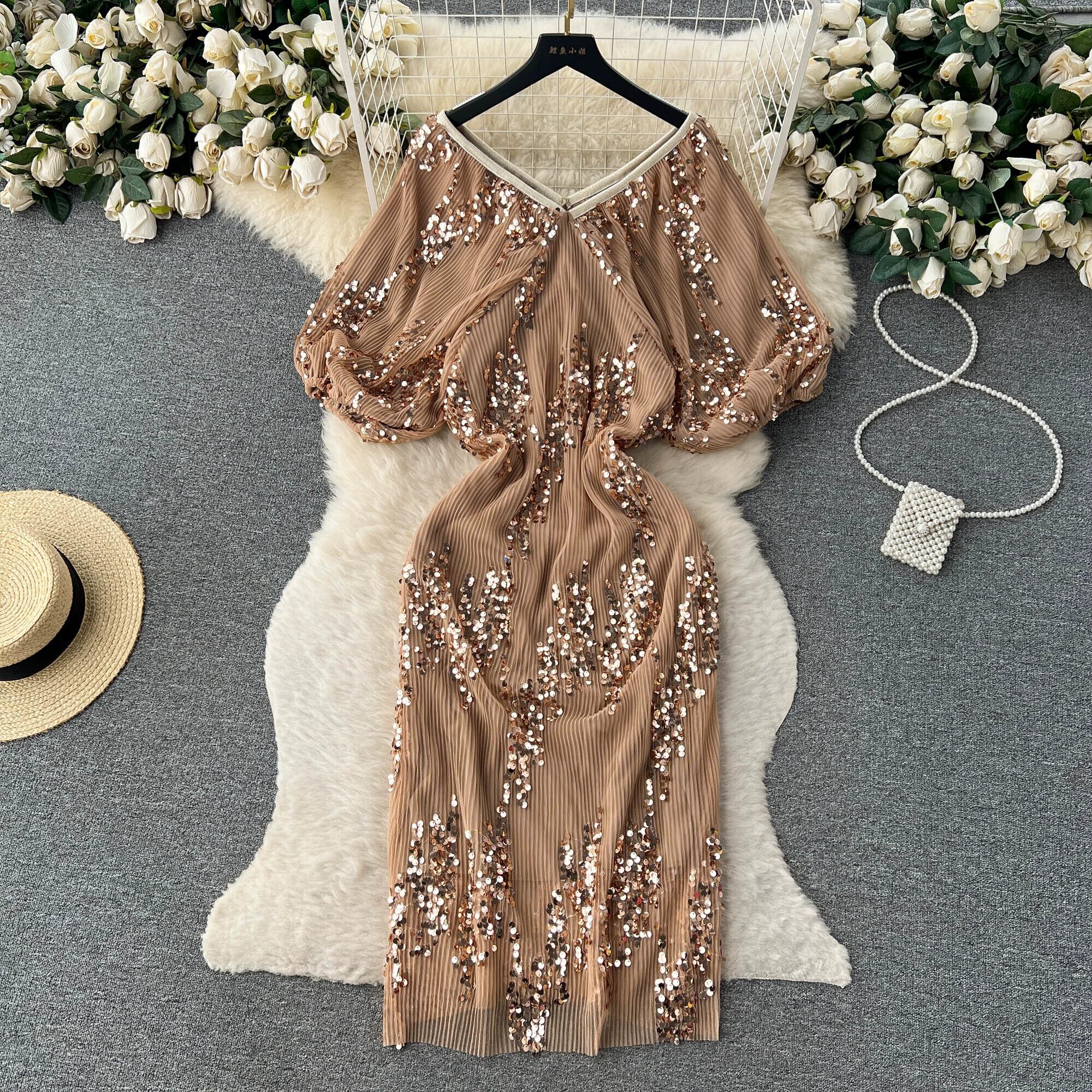 セレブの高級ドレス宴会スカート女性の夏の新しい気質フレンチワンショルダーパフスリーブスパンコールドレス サマー 夏物 lyxaj19865764497