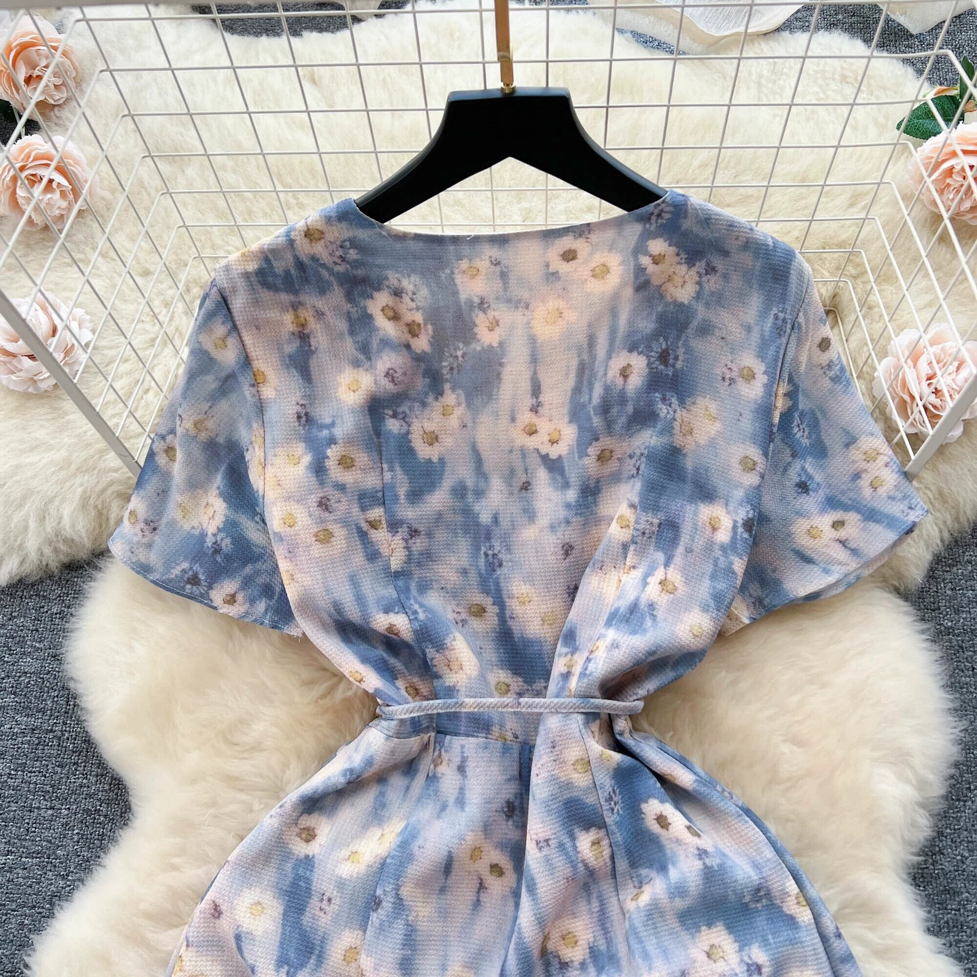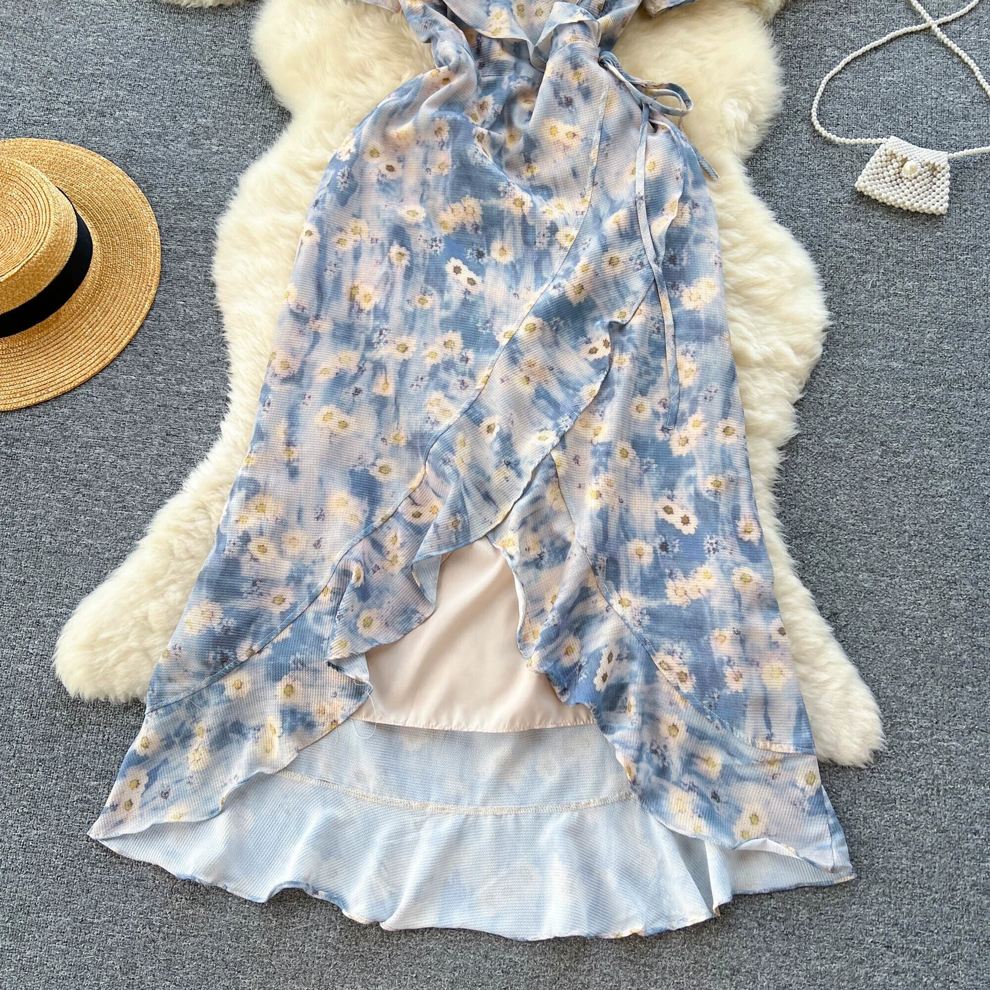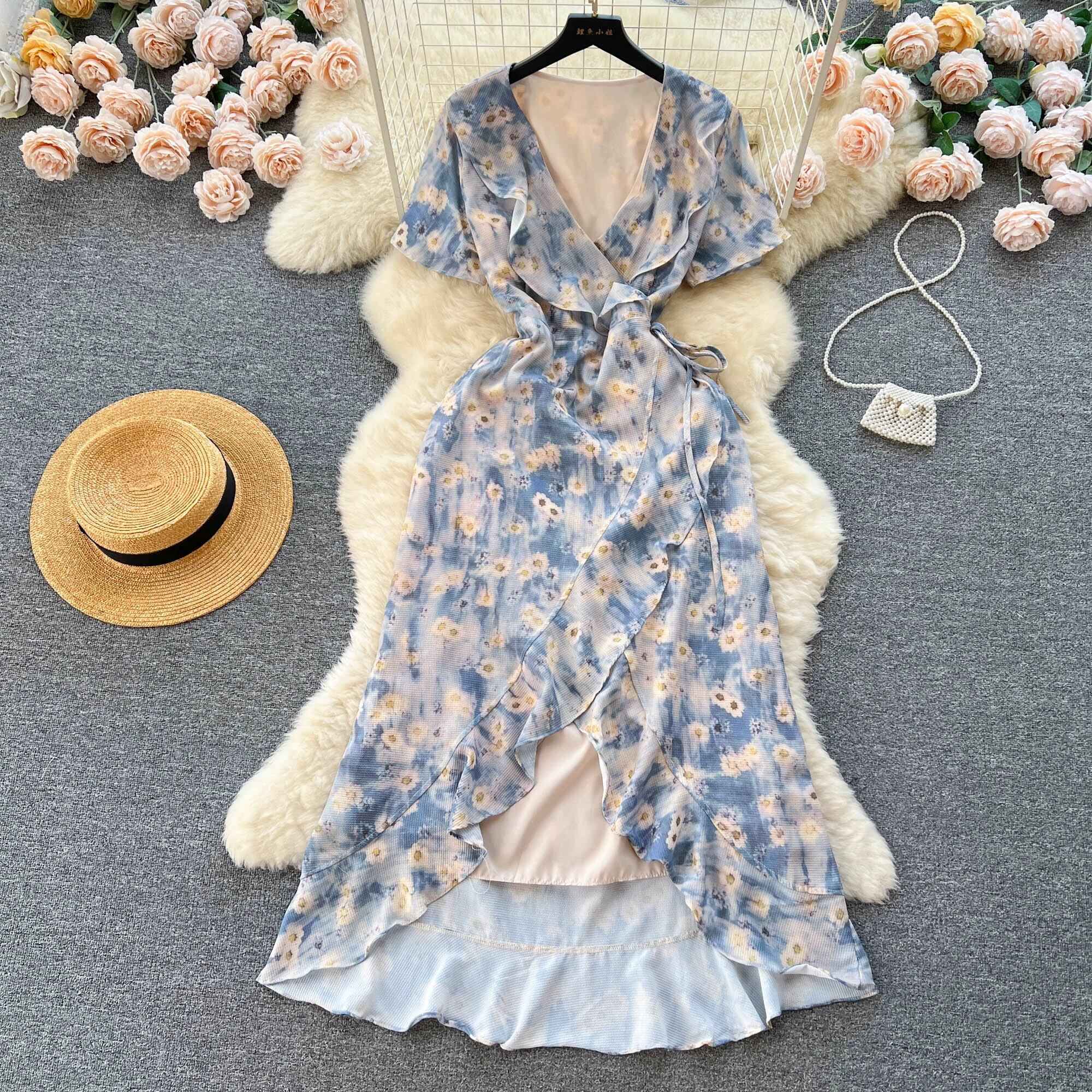 気質と高級フレンチワンピースタイウエスト痩身不規則なフリル花柄シフォンドレス女性 lyxaj37184114899