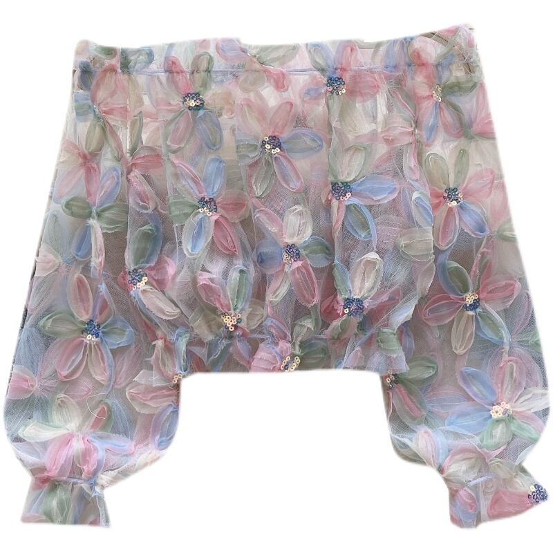 フランスのスーパーフェアリーワンショルダー長袖立体フラワーメッシュシャツ女性の夏のゆったりとした薄手のオールマッチシックなトップ ロング サマー 夏物 フラワーデザイン lyxaj32752035611