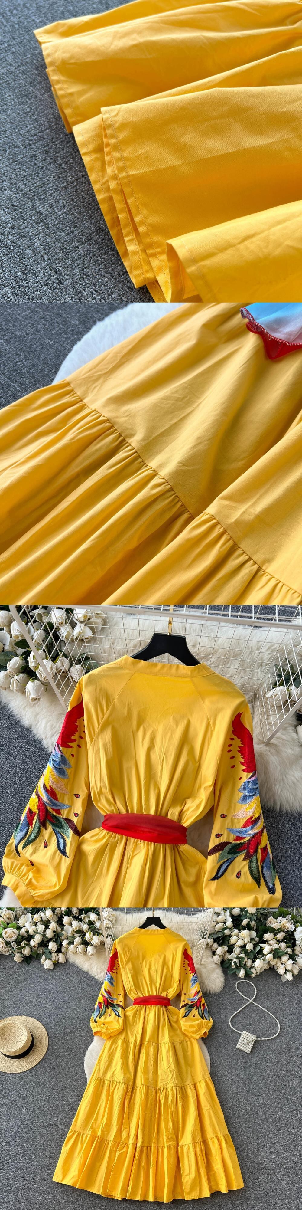 2023 夏レトロエスニックスタイル刺繍 V ネックドレス女性スリムスイングロングスカート レッド サマー 夏物 Vネック lyxaj58188886589