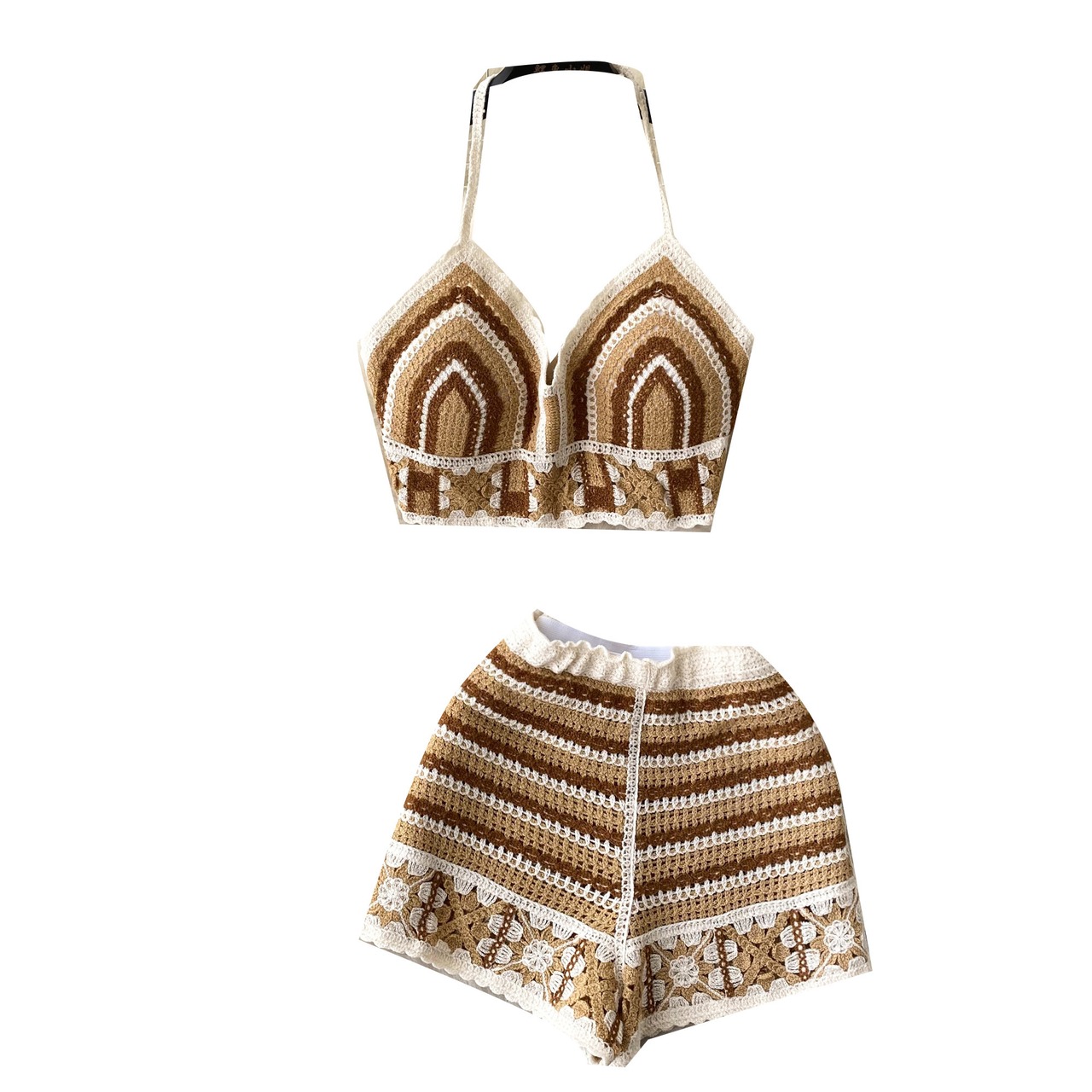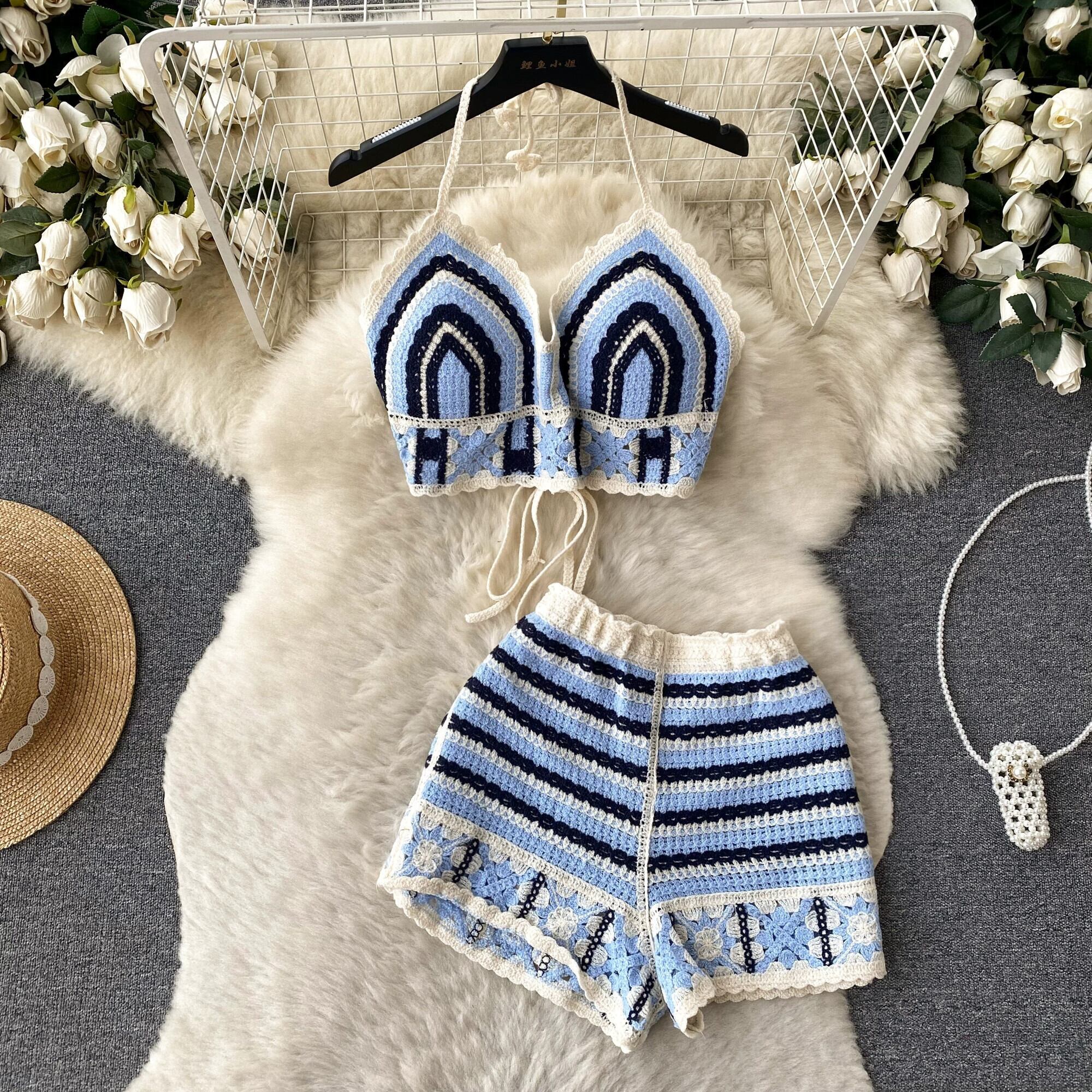旅行ホリデースタイルスーツ女性の中空織りハンギングネックキャミソールハイウエストワイドレッグショーツツーピーストレンディ ハイウェスト ブルマー ワイドパンツ lyxaj31491542491