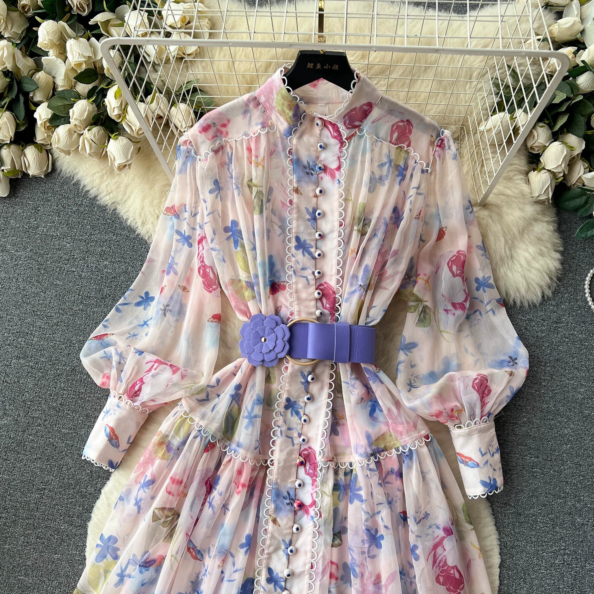 フランスの気質の高級感スタンドカラーランタン長袖花柄ドレスレディースネクタイウエストビッグスイングシフォンフェアリードレス ロング lyxaj8026414369