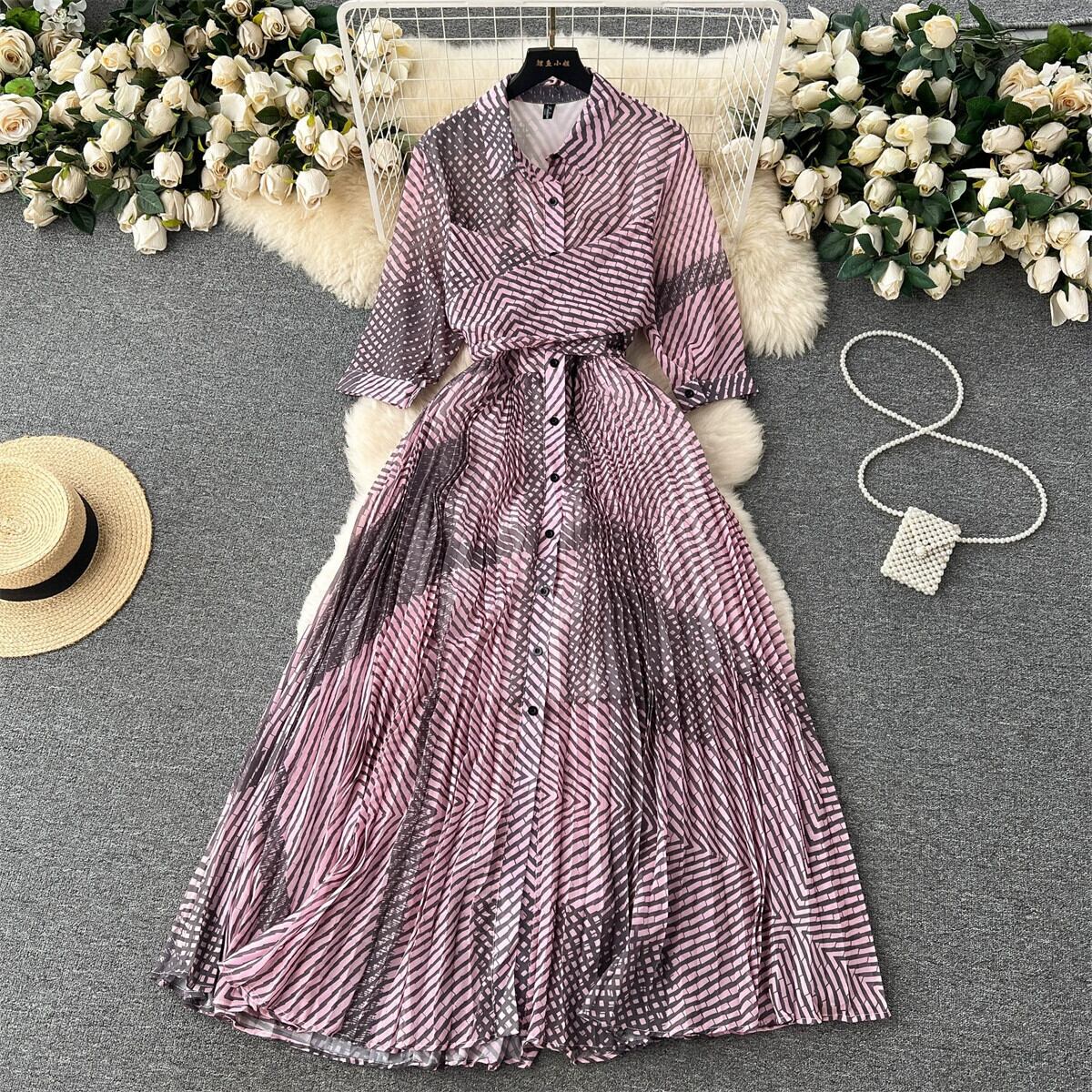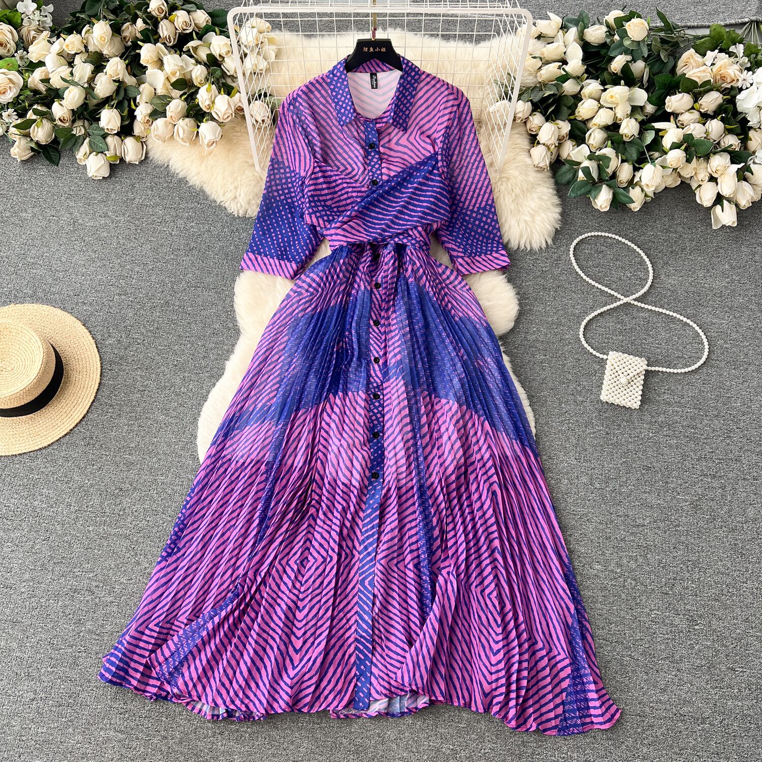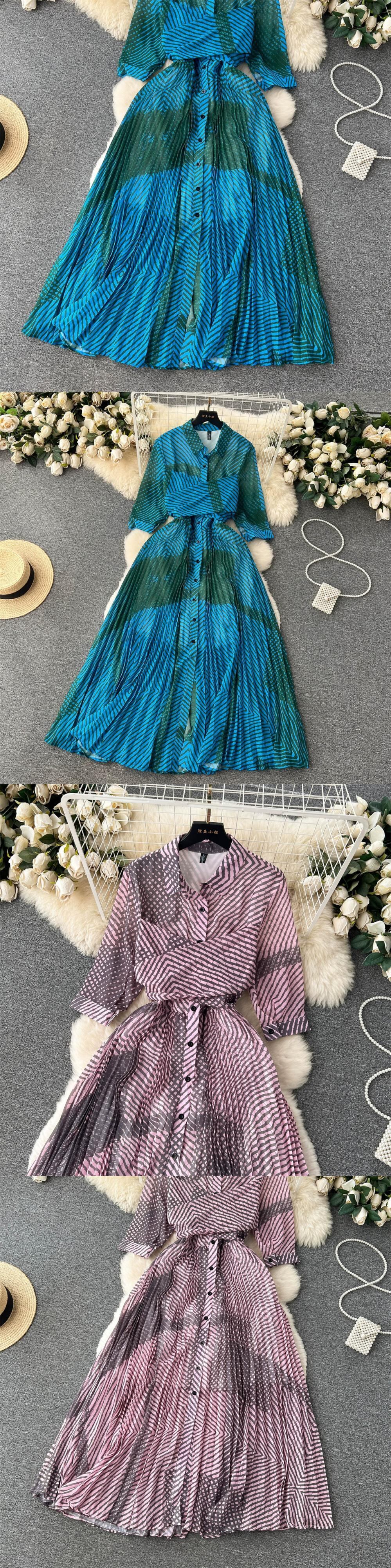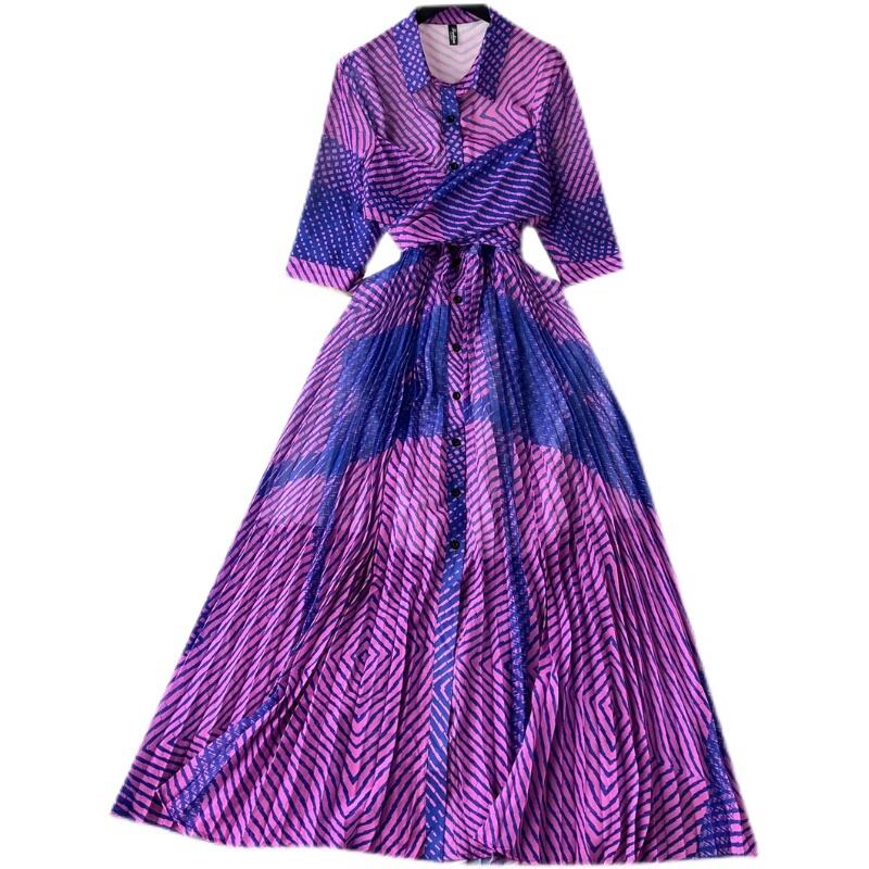 フレンチスタイルのハイエンド5分袖プリントカラーブロッキングシャツドレス女性ニッチウエスト痩身気質プリーツロングスカート lyxaj31044167595