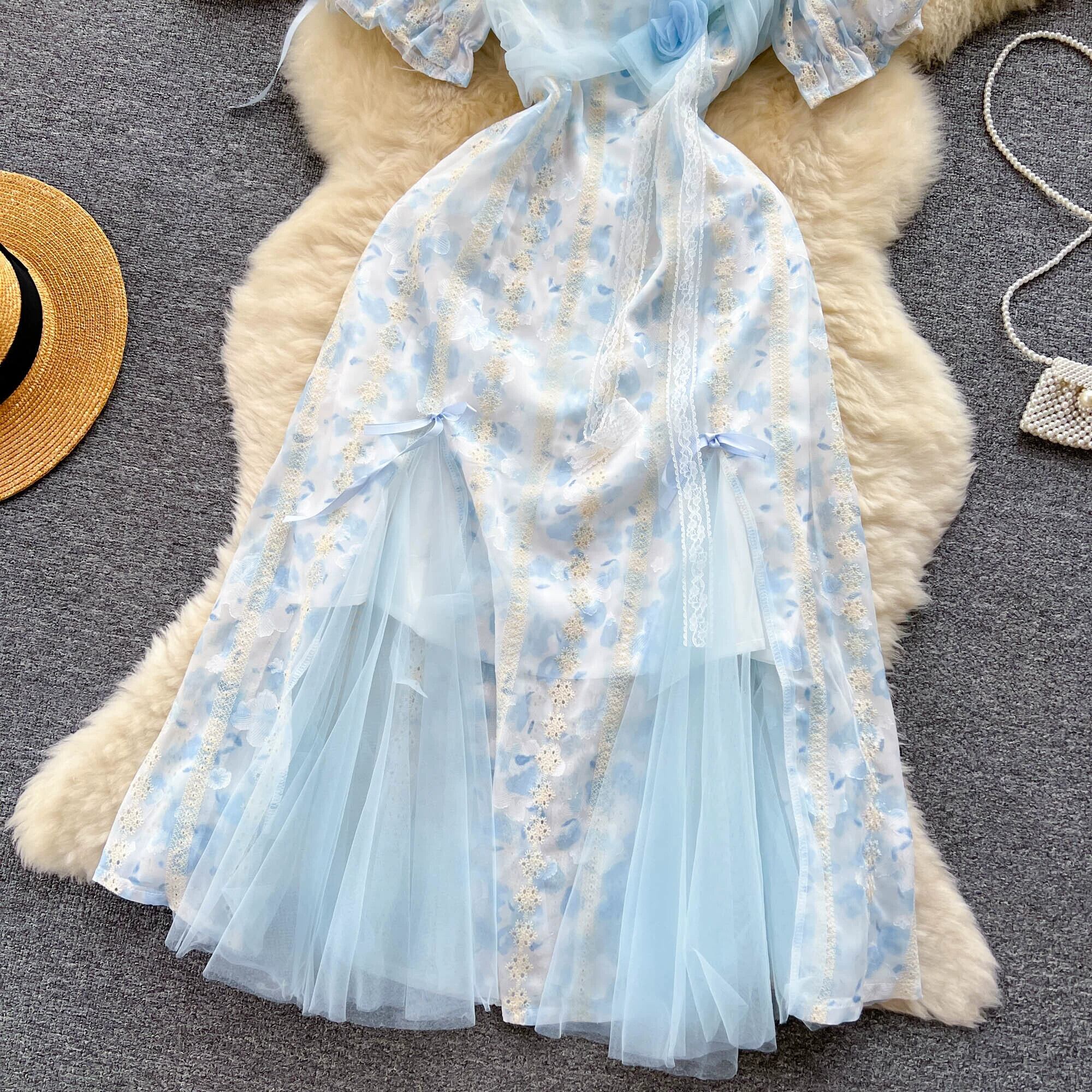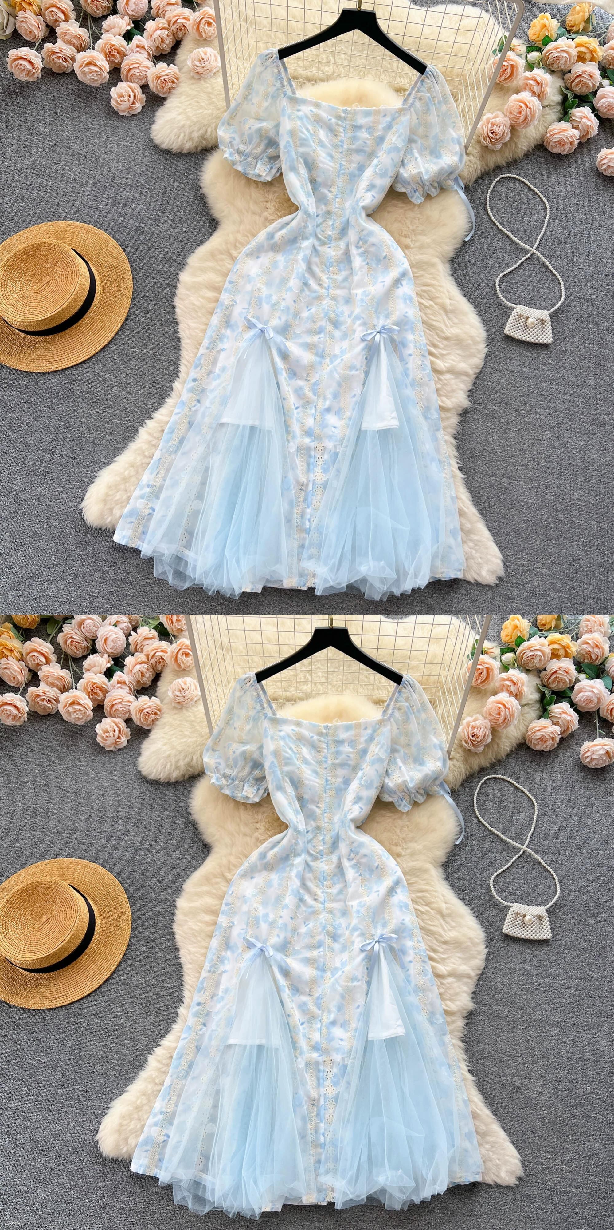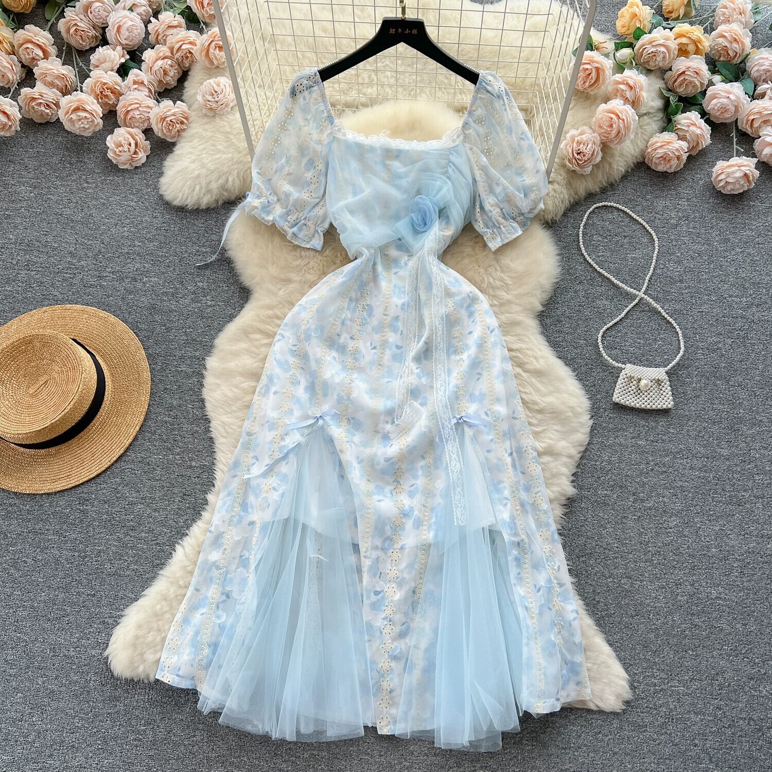 フランスの甘くて優しいスクエアネックパフスリーブ妖精ドレスは細くて気質ウエストメッシュステッチ花柄ドレスに見えます 大人ガーリー スウィート キュート カジュアル スクウェア lyxaj10538601751