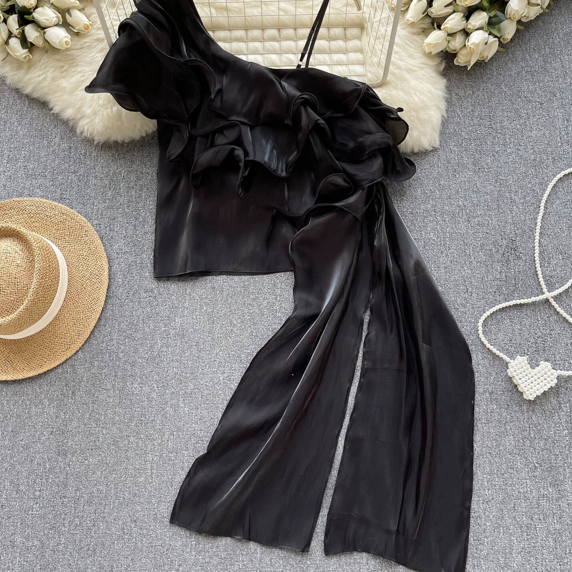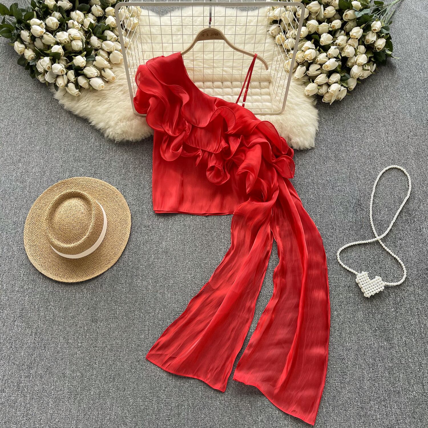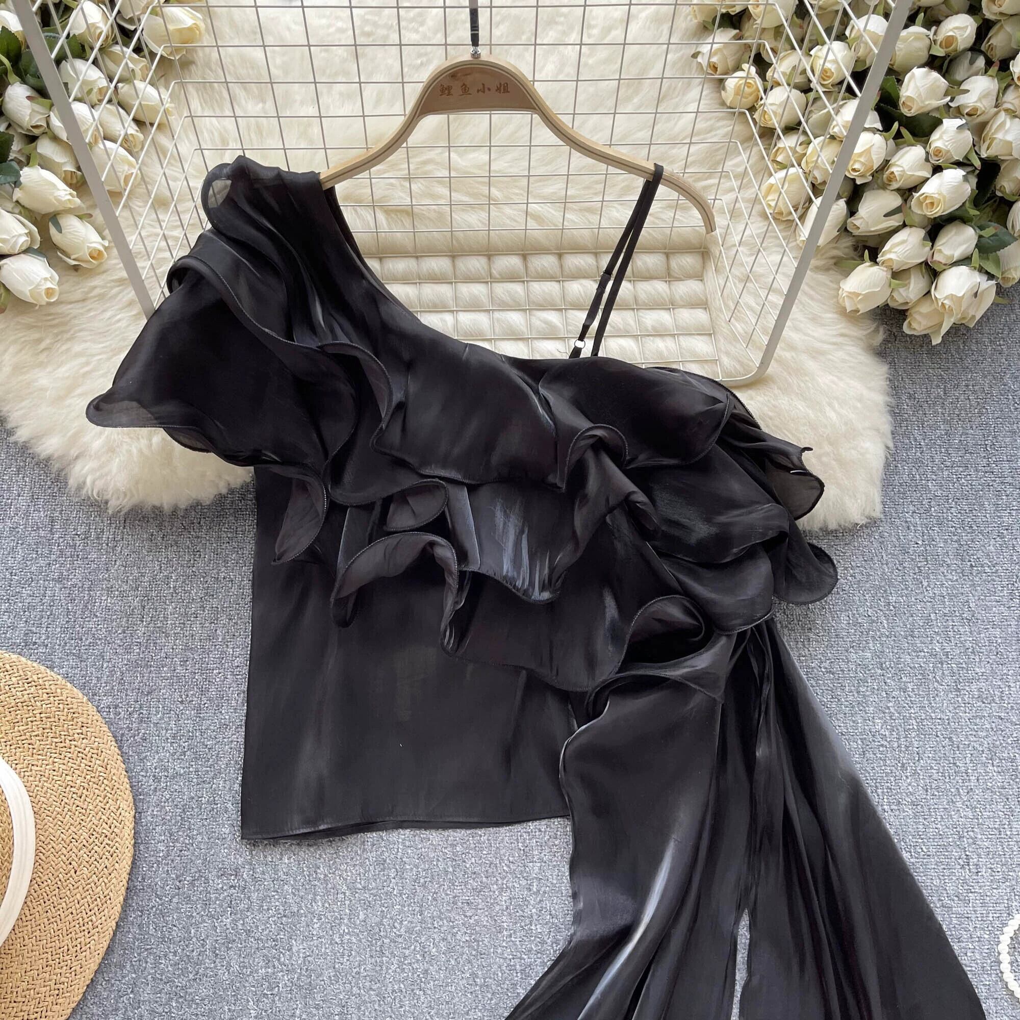 2023 夏の新フレンチスタイルの気質ファッションハイエンドセンス斜めショルダーストラップフリルエッジ不規則なシフォントップ潮 サマー 夏物 lyxaj86960759423