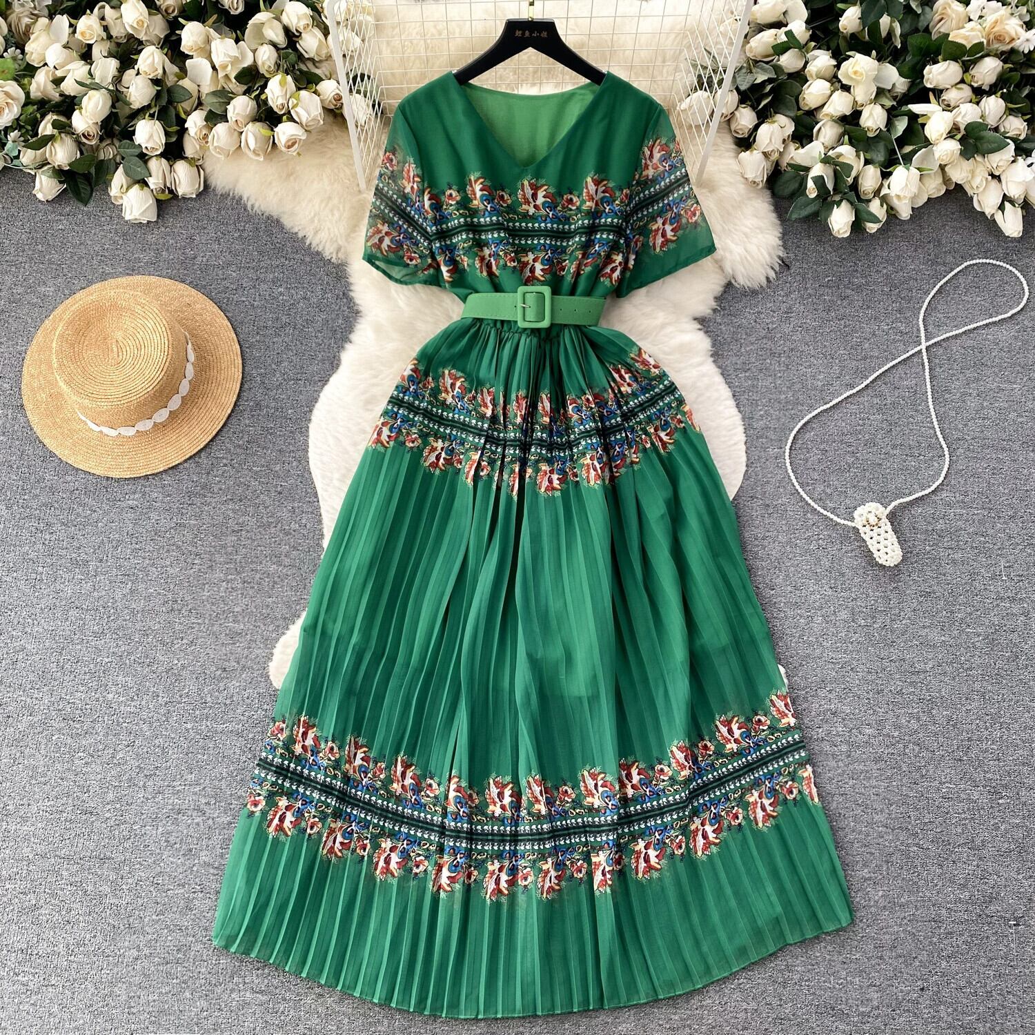 夏の海辺の休日エスニックスタイル半袖プリントドレスレディースネクタイウエスト痩身aラインシフォンビーチスカート サマー 夏物 lyxaj6467051922
