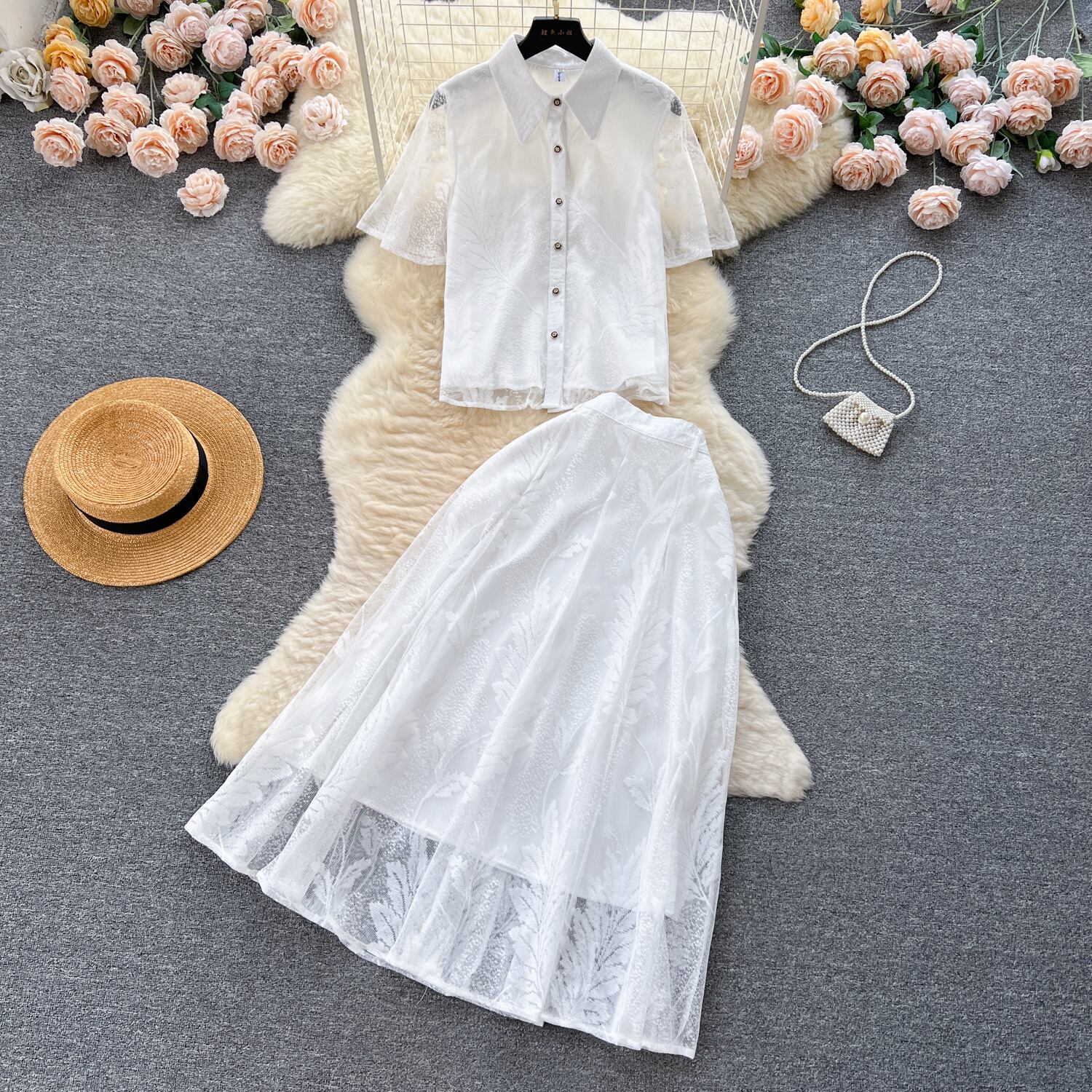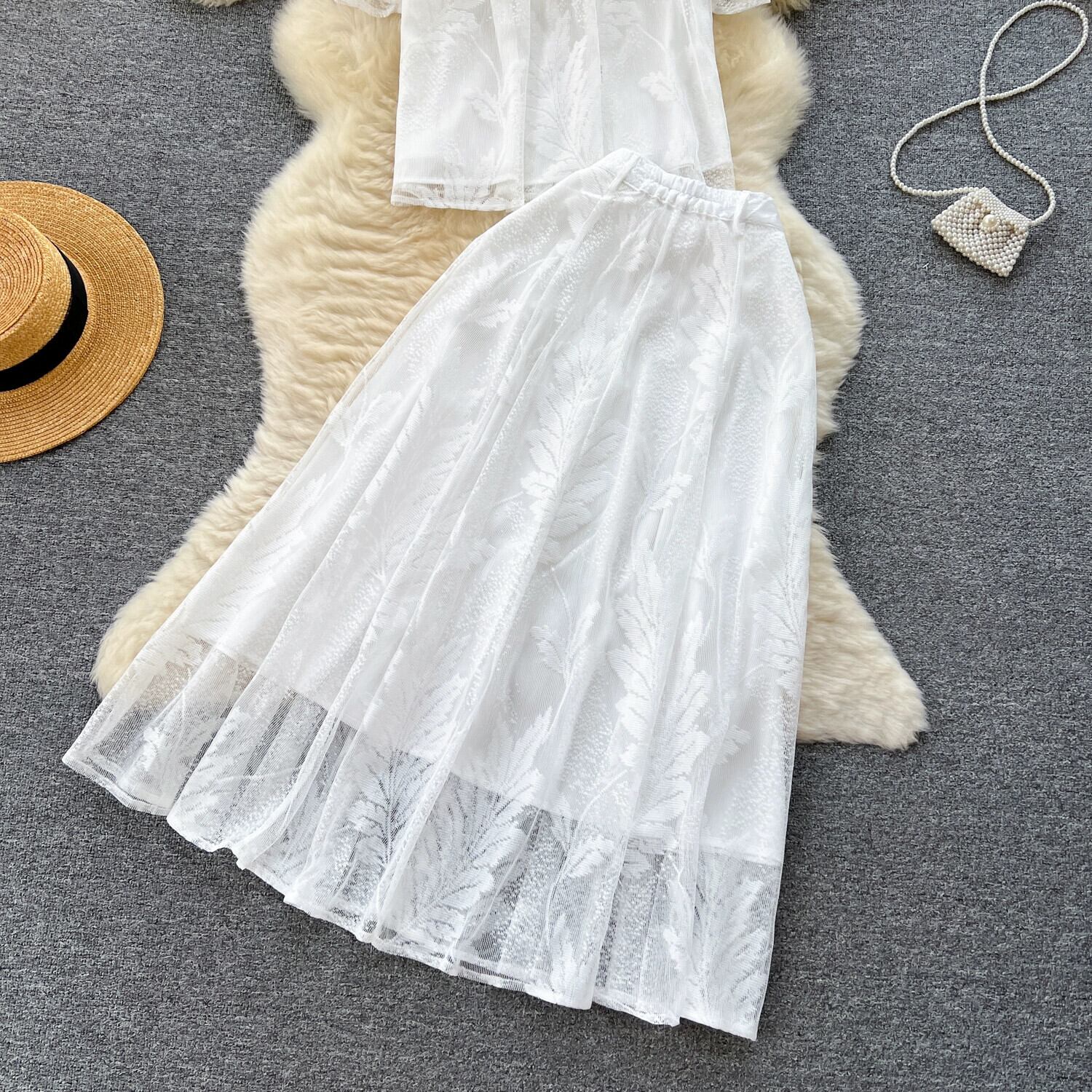 優しい風フレンチスイートスーツレディース夏薄手ラペル半袖レースシャツハイウエスト痩身スカート ハイウェスト 大人ガーリー スウィート キュート カジュアル サマー 夏物 lyxaj13257459329