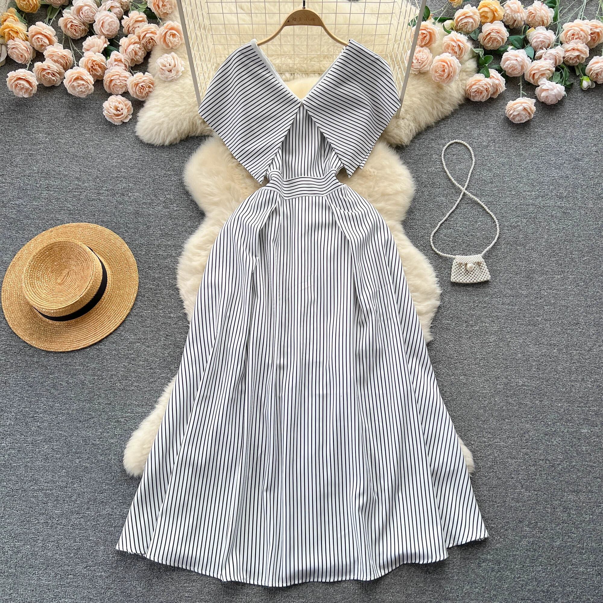 シックな夏ニッチラペルヒットカラーストライプドレス女性のウエストスリム気質フレンチノースリーブドレス サマー 夏物 lyxaj13592029225