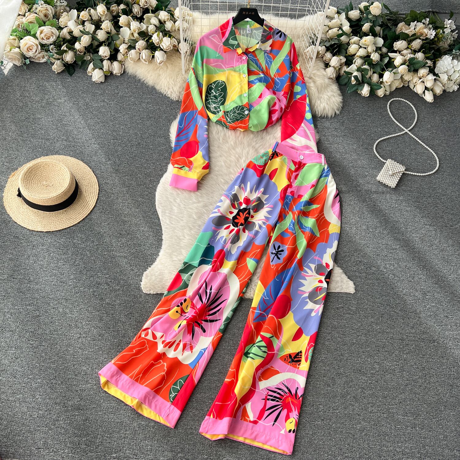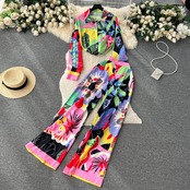 ヨーロッパとアメリカンカジュアルファッションプリントスーツレディースルーズ長袖シングルブレストシャツ2点セットハイウエストスリムワイドレッグパンツ ハイウェスト ロング ヨーロピアン lyxaj79969518886