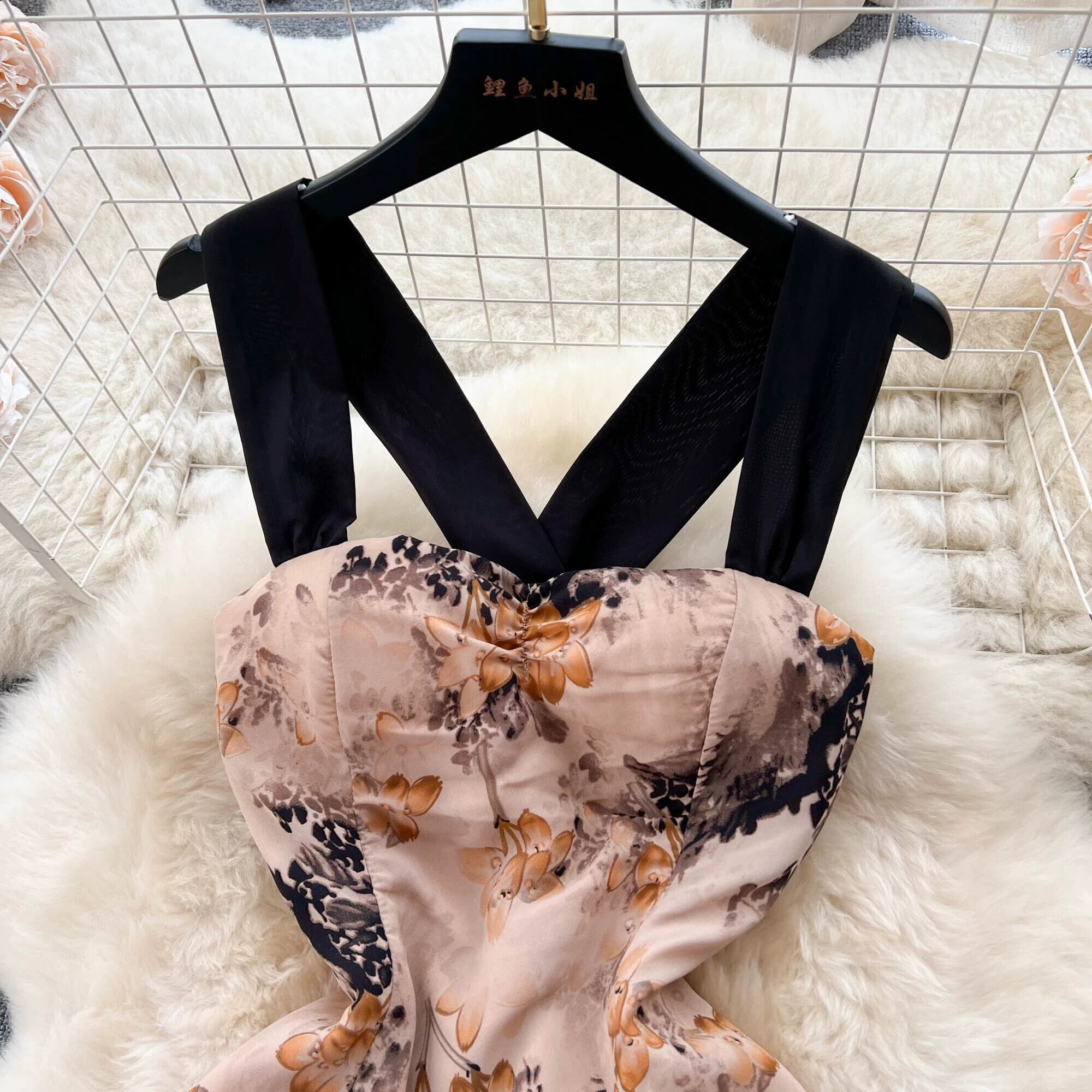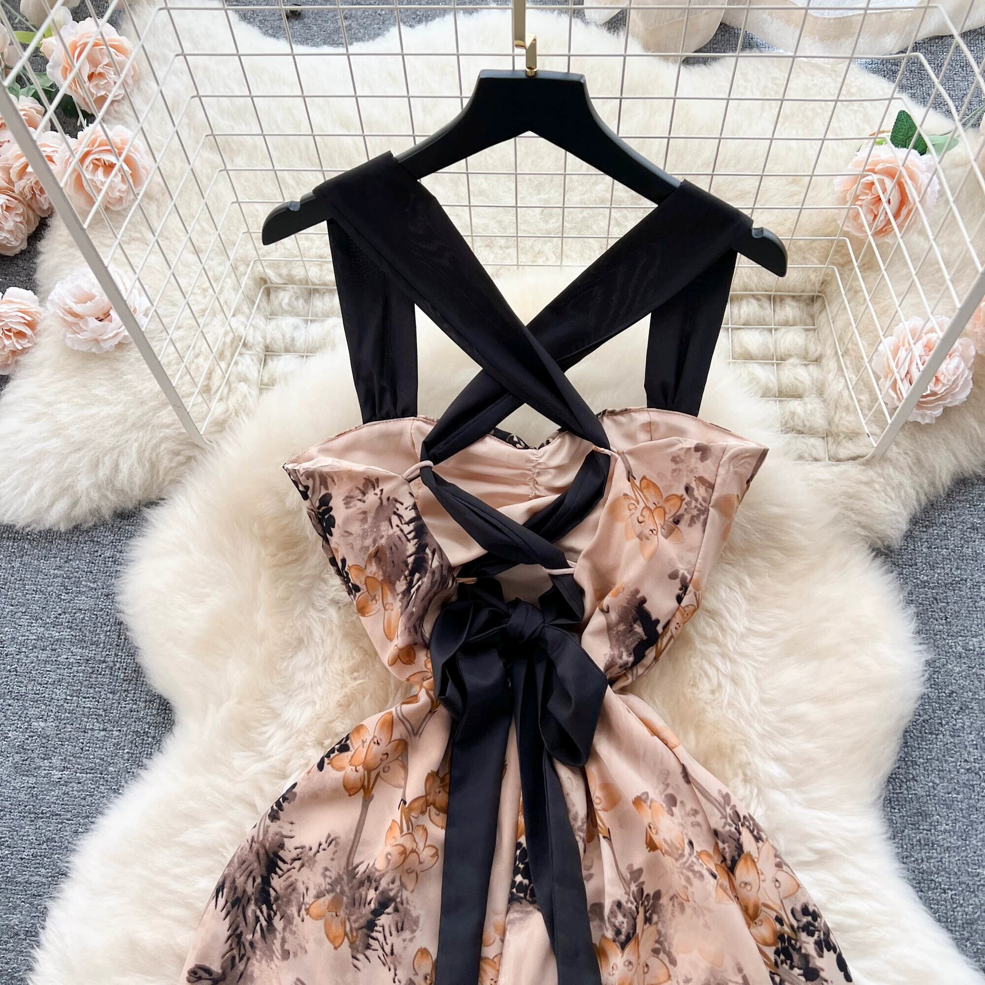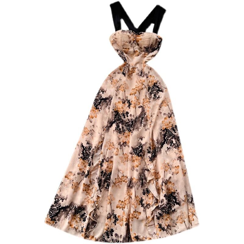 フレンチロマンチックなレトロな雰囲気の花サスペンダードレス女性中空ネクタイウエストウエスト気質スーパーフェアリーホリデードレス 花柄 lyxaj30014552195