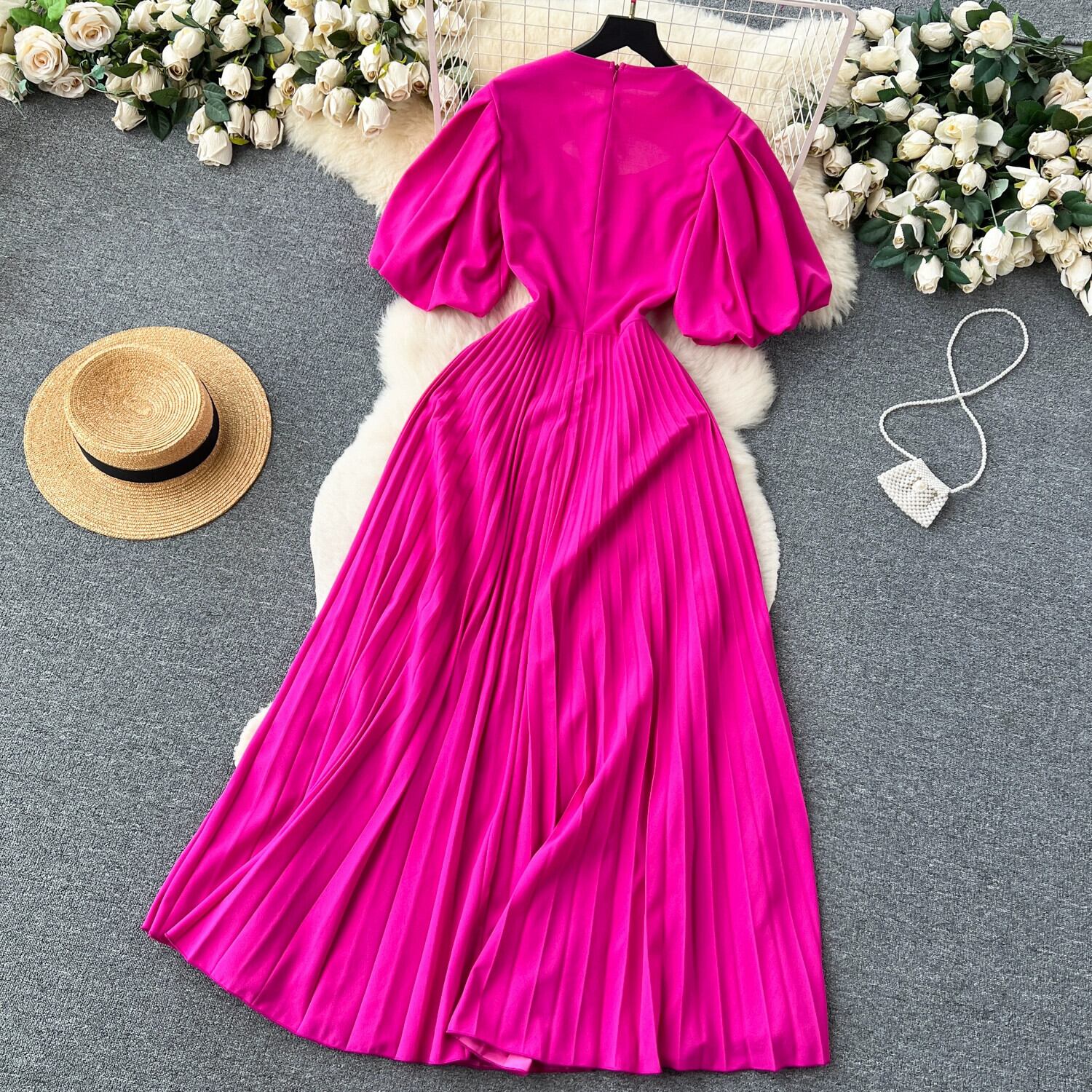 夏のウエストデザイン感覚ラウンドネックパフスリーブドレスレディースウエスト痩身気質aライン大きいドレスロングスカート サマー 夏物 Oネック lyxaj1042499054
