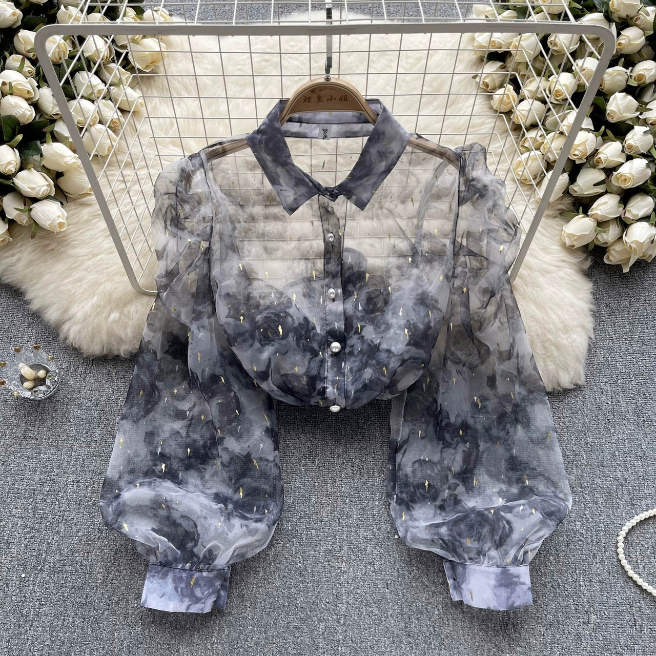 フレンチスタイルの優しい風タイダイプリントパフスリーブシャツ女性ニッチデザインセンス薄肉シースルー長袖日焼け止めトップ ロング lyxaj24766699076