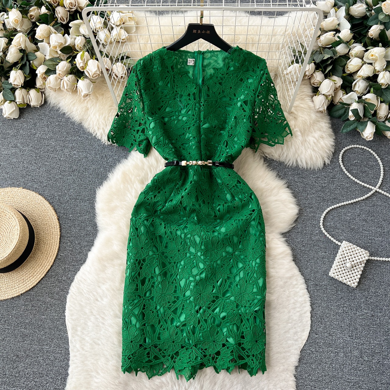 レトロな高品質ラウンドネック半袖中空フックフラワーレースドレス女性のネクタイウエスト気質aラインセレブドレス Oネック フラワーデザイン lyxaj7579869845